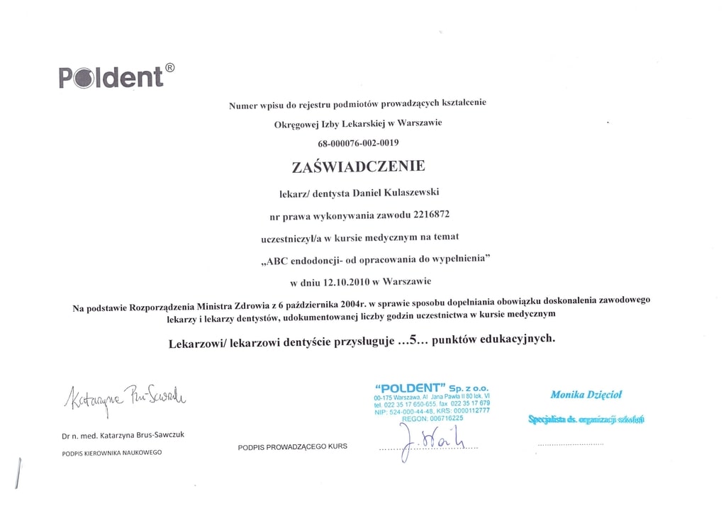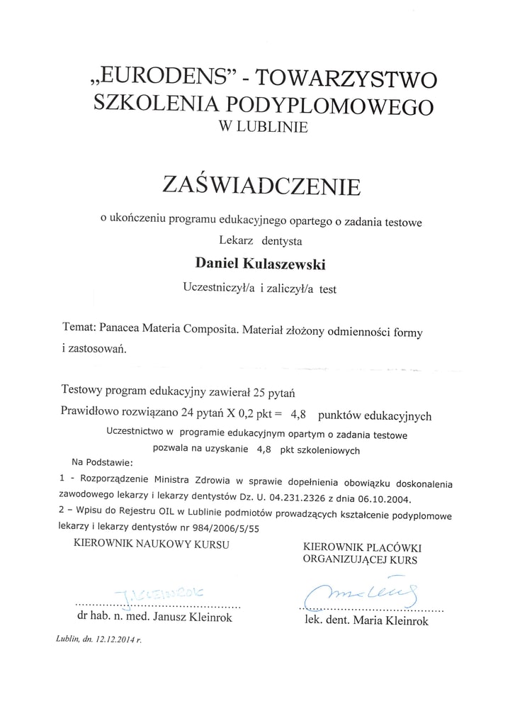 Graduate of the Medical University of Bialystok in 2006. Dentist with many years of experience who specialises in conservative dentistry, aesthetic prosthetics, dental surgery and implantology.
