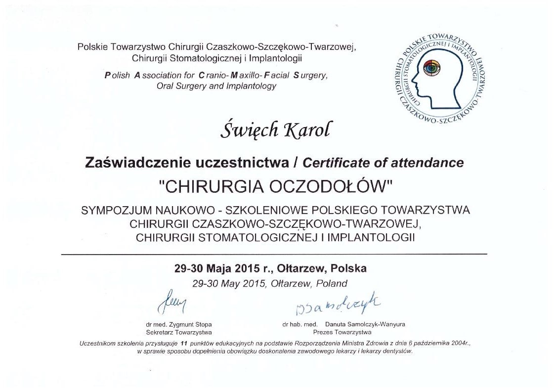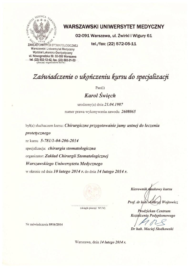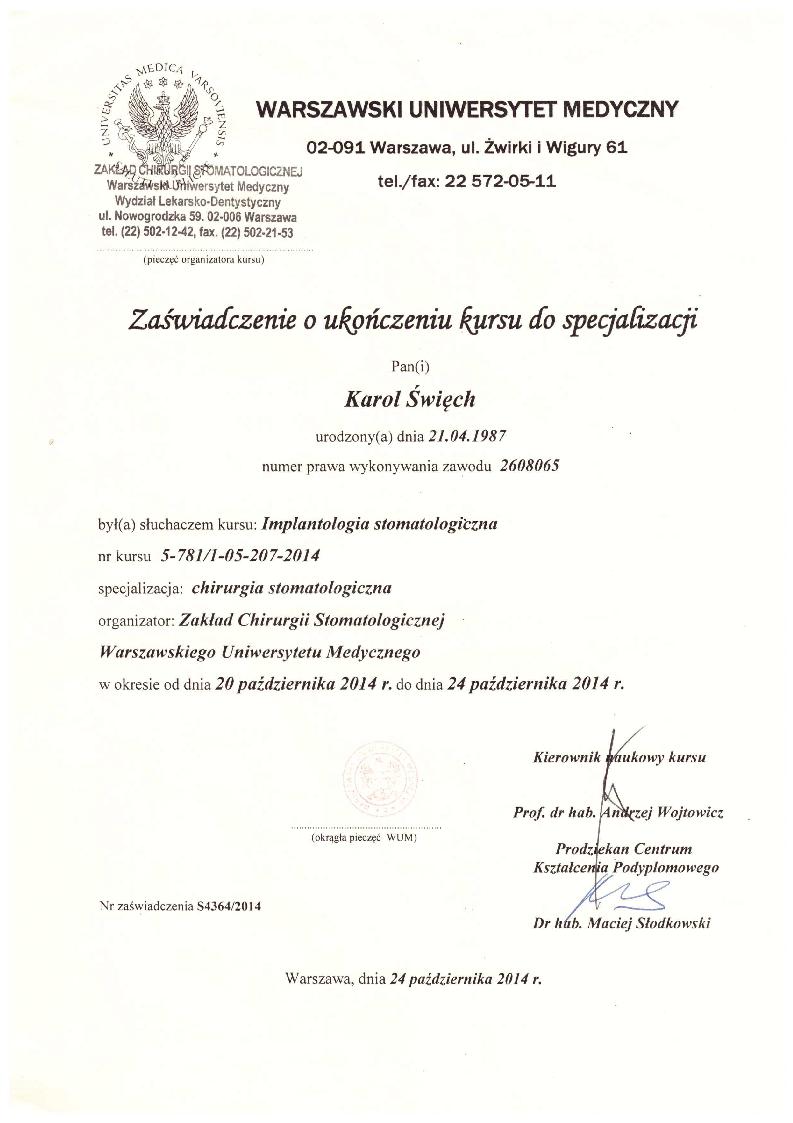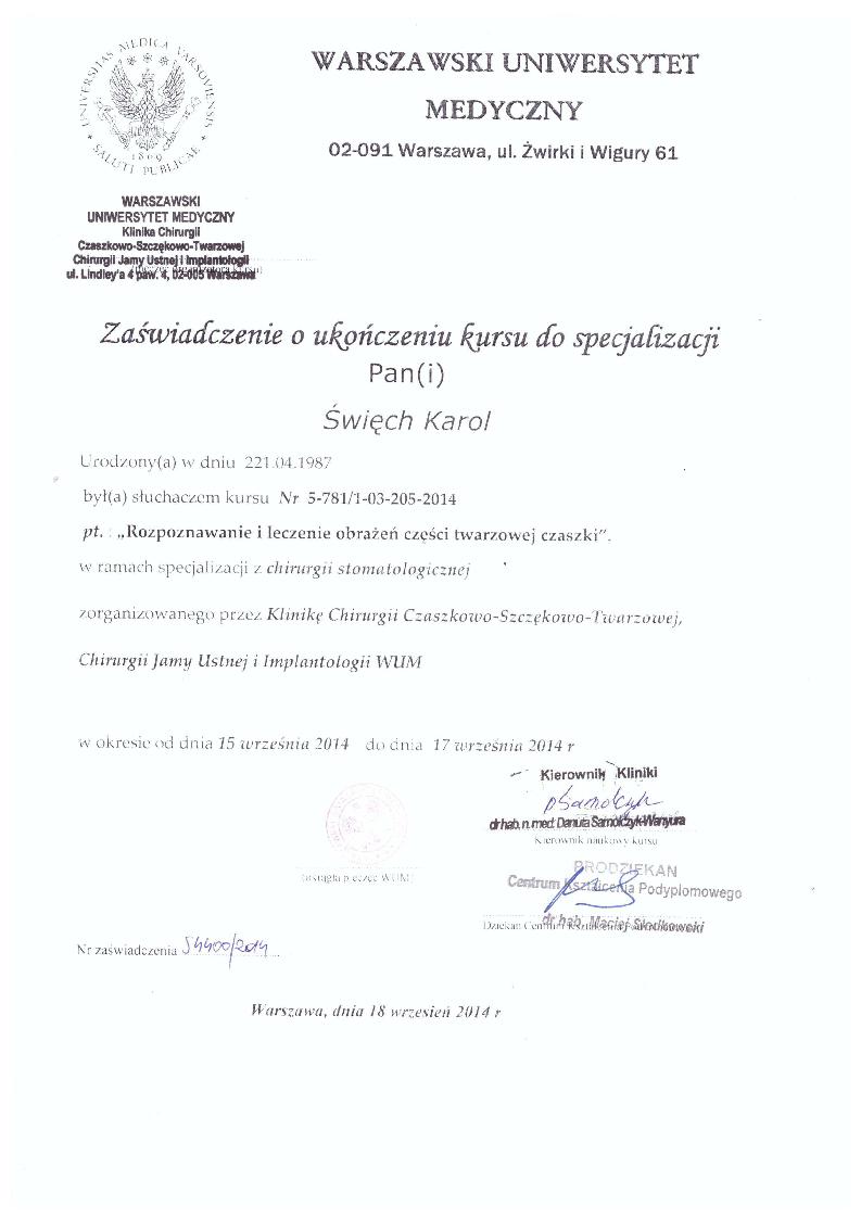 Specialist in dental surgery. Graduated from the Medical University of Lublin with a very good result. He completed his postgraduate internship at the Mazovian Dental Centre in Warsaw. In 2013-2018, he worked at the Department of Craniofacial, Maxillofacial, Oral and Implant Surgery at the Medical University of Warsaw. He regularly improves his qualifications by participating in surgical and implantology training courses. He specialises in dental surgery, implantology and bone regeneration.