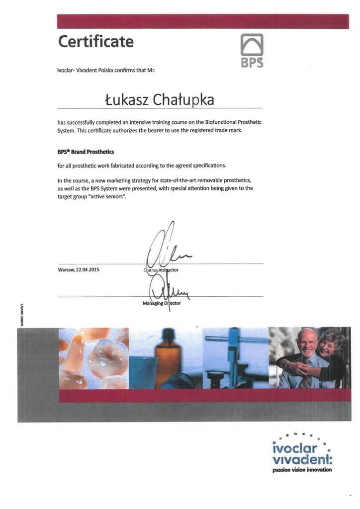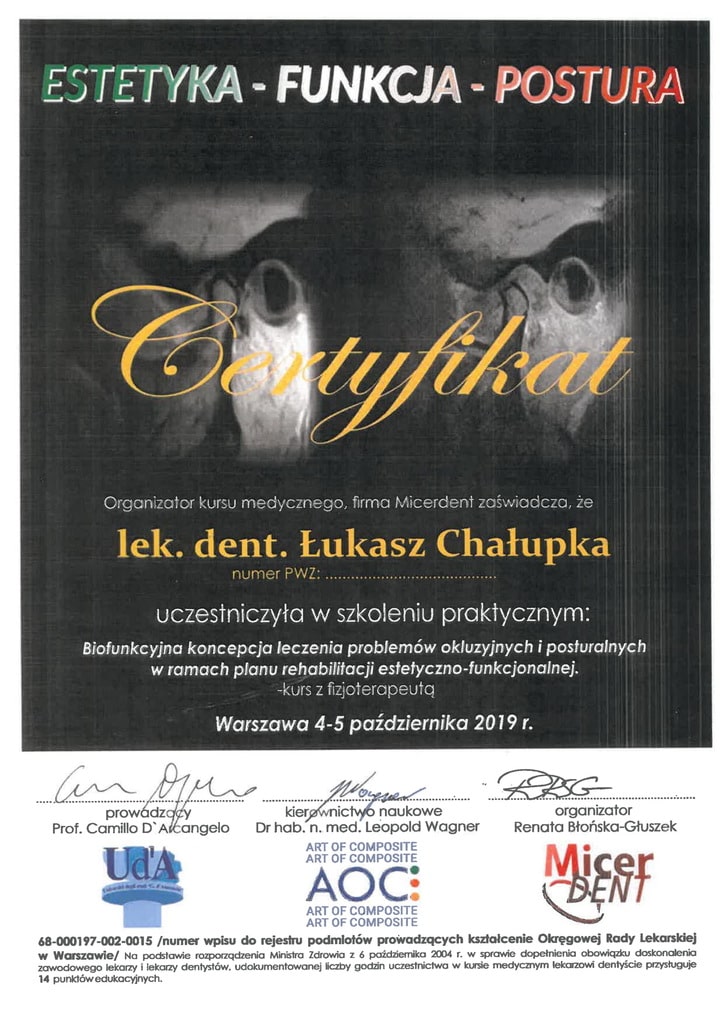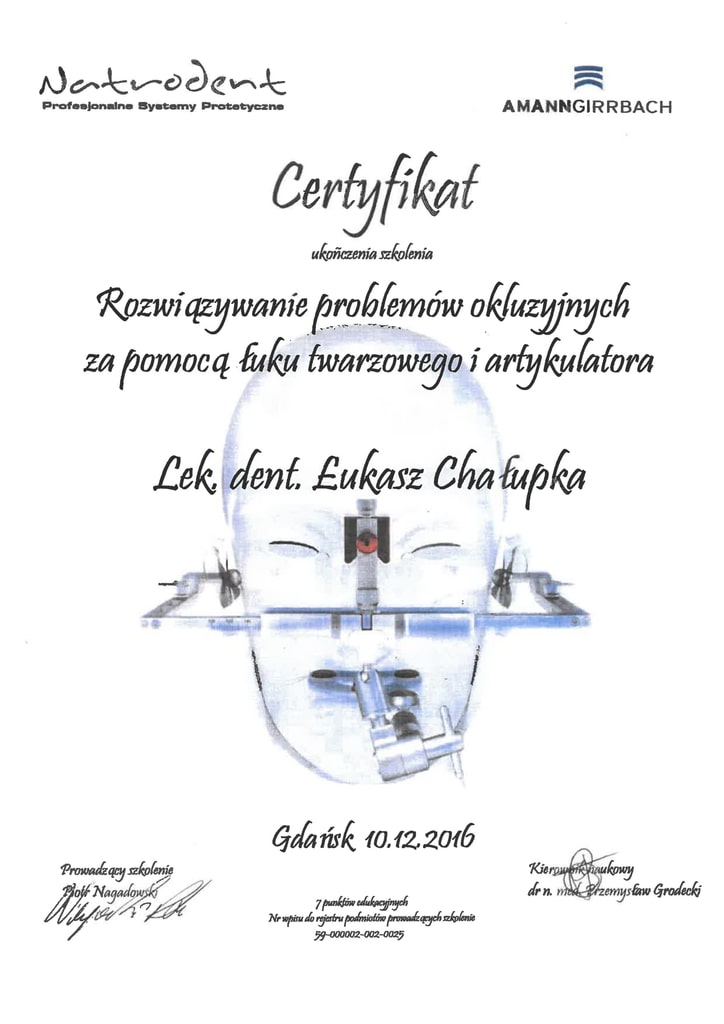 Graduated from the Medical University of Warsaw in 2011. He did his postgraduate internship at the Central Sports Medicine Centre in Warsaw. He is a participant in many courses and trainings in dentistry and prosthetics.