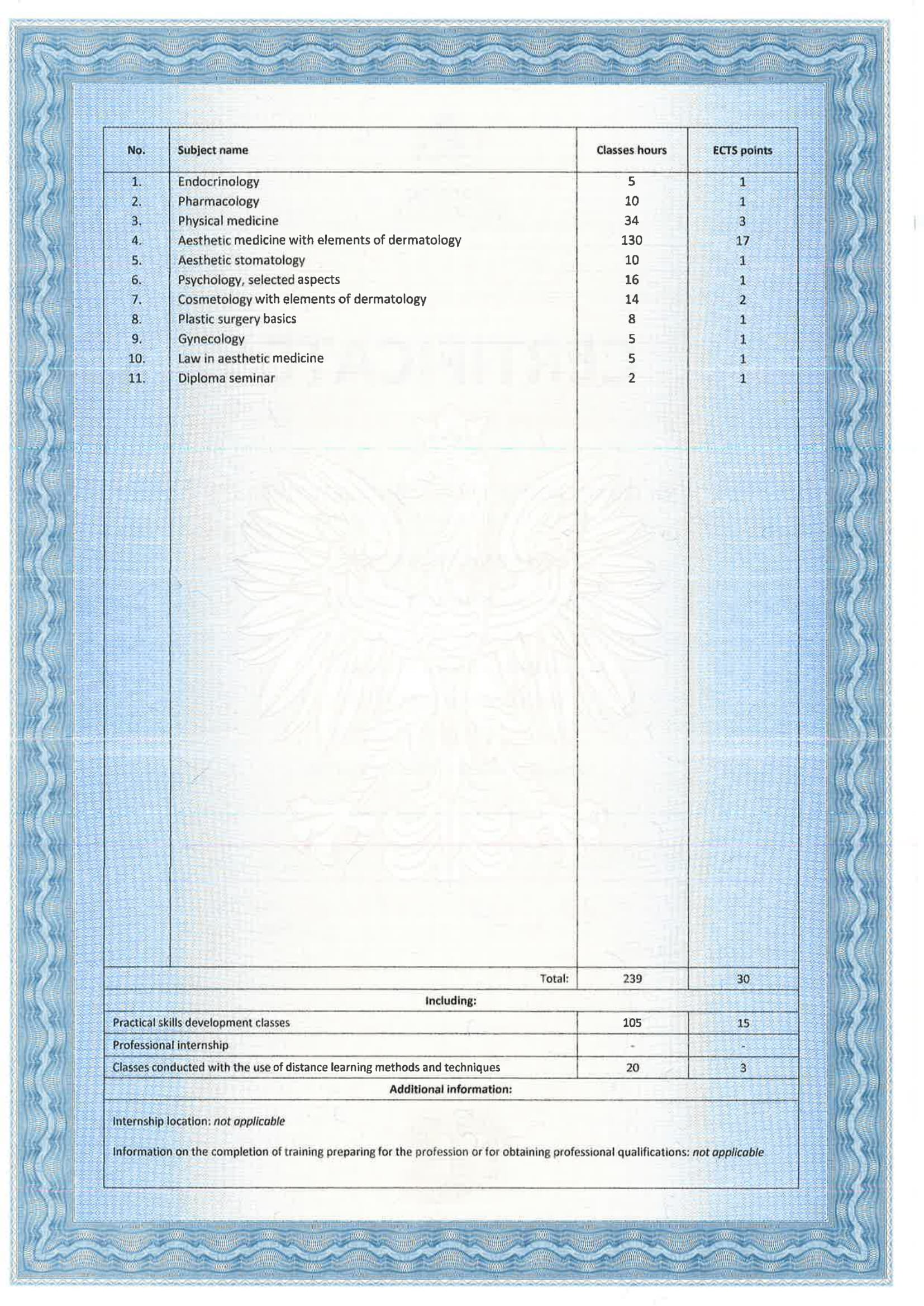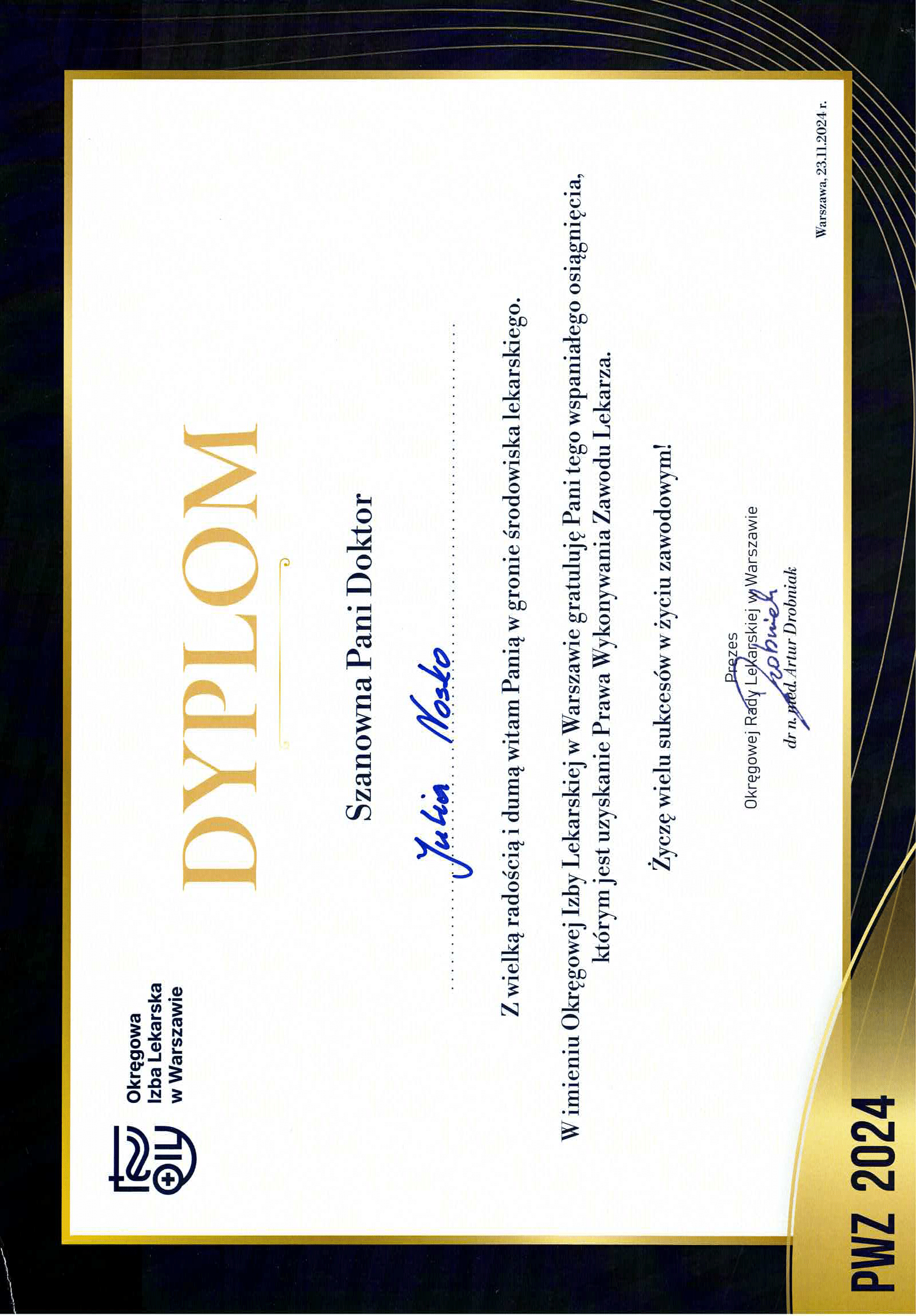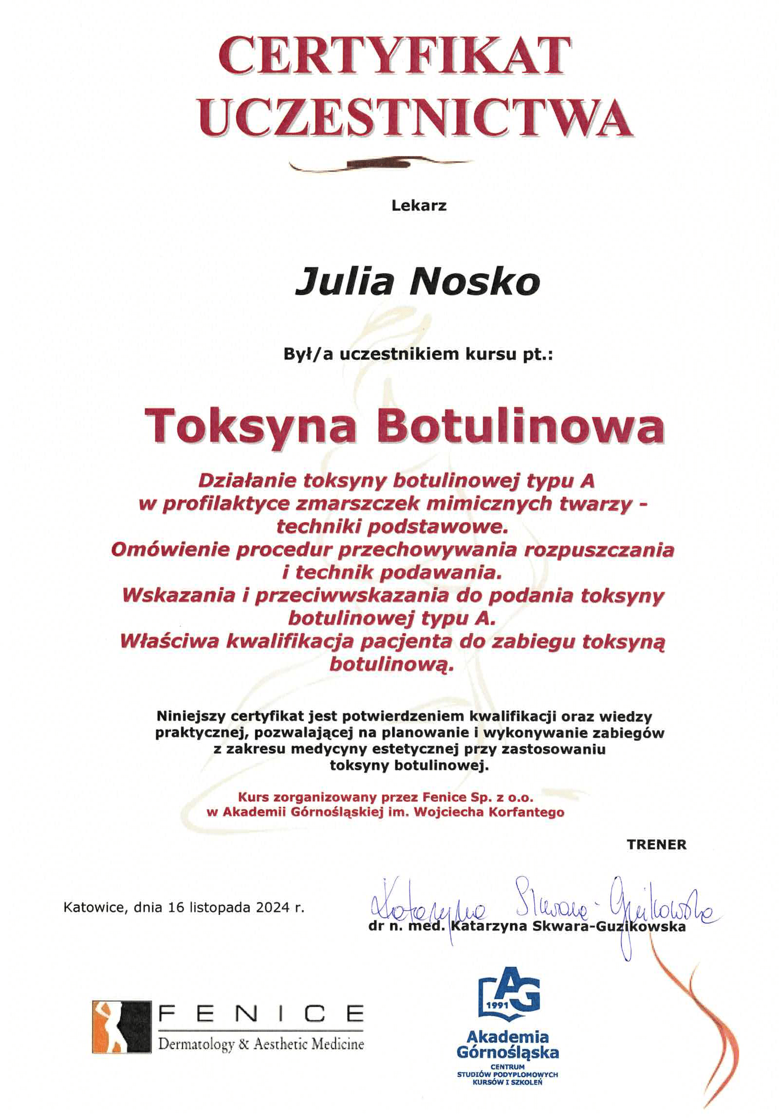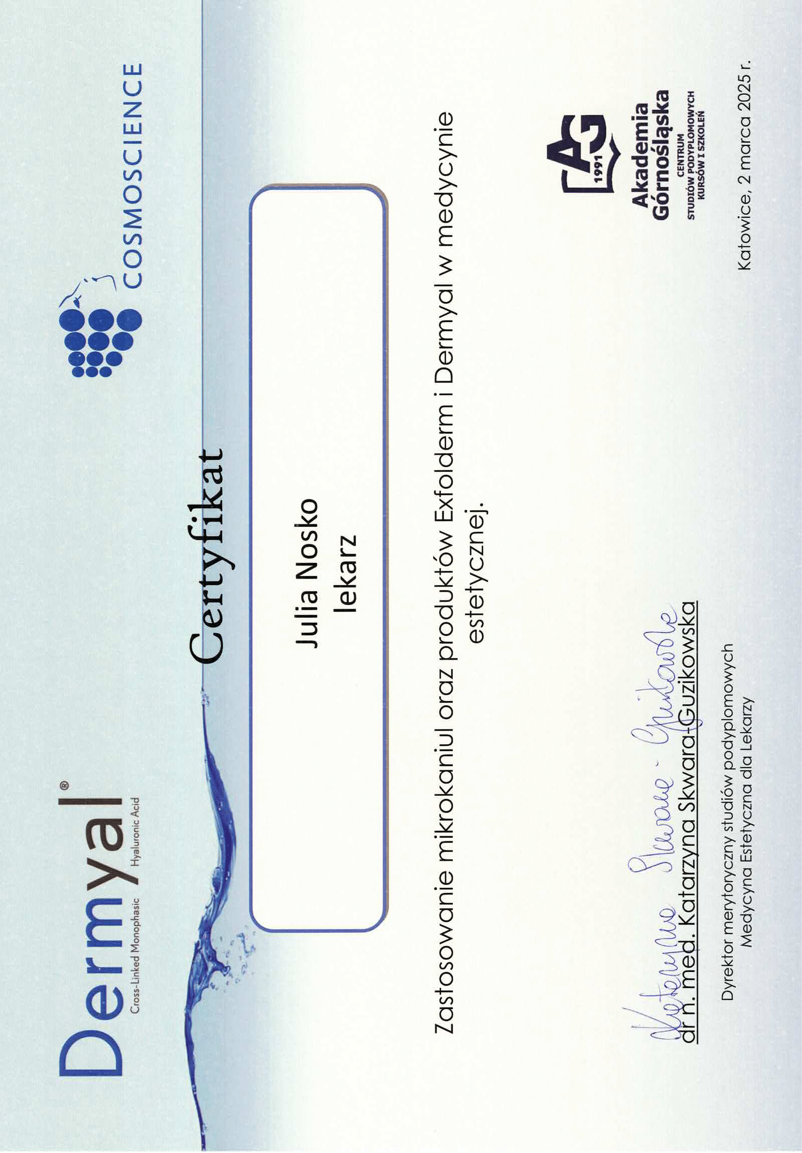 Wierzę, że medycyna estetyczna służy wydobywaniu indywidualnego piękna. Słucham potrzeb moich pacjentów i poprzez odpowiednio dobrane zabiegi dążę do tego, aby czuli się jak najlepiej w swoim ciele. Moje priorytety to bezpieczeństwo pacjenta oraz skuteczność zabiegu. Ukończyłam studia medyczne na Uczelni Łazarskiego w Warszawie oraz kształciłam się w zakresie medycyny estetycznej na Akademii Górnośląskiej w Katowicach, a także podczas licznych kursów w Warszawie i Wrocławiu. Dodatkowo pracuję w Wojskowym Instytucie Medycznym. Pracuję holistycznie, nie ograniczając się tylko do złudnej poprawy wyglądu. Stawiam na poprawę kondycji skóry i profilaktykę przeciwstarzeniową, która jest doskonałą inwestycją w zdrowie i samopoczucie.