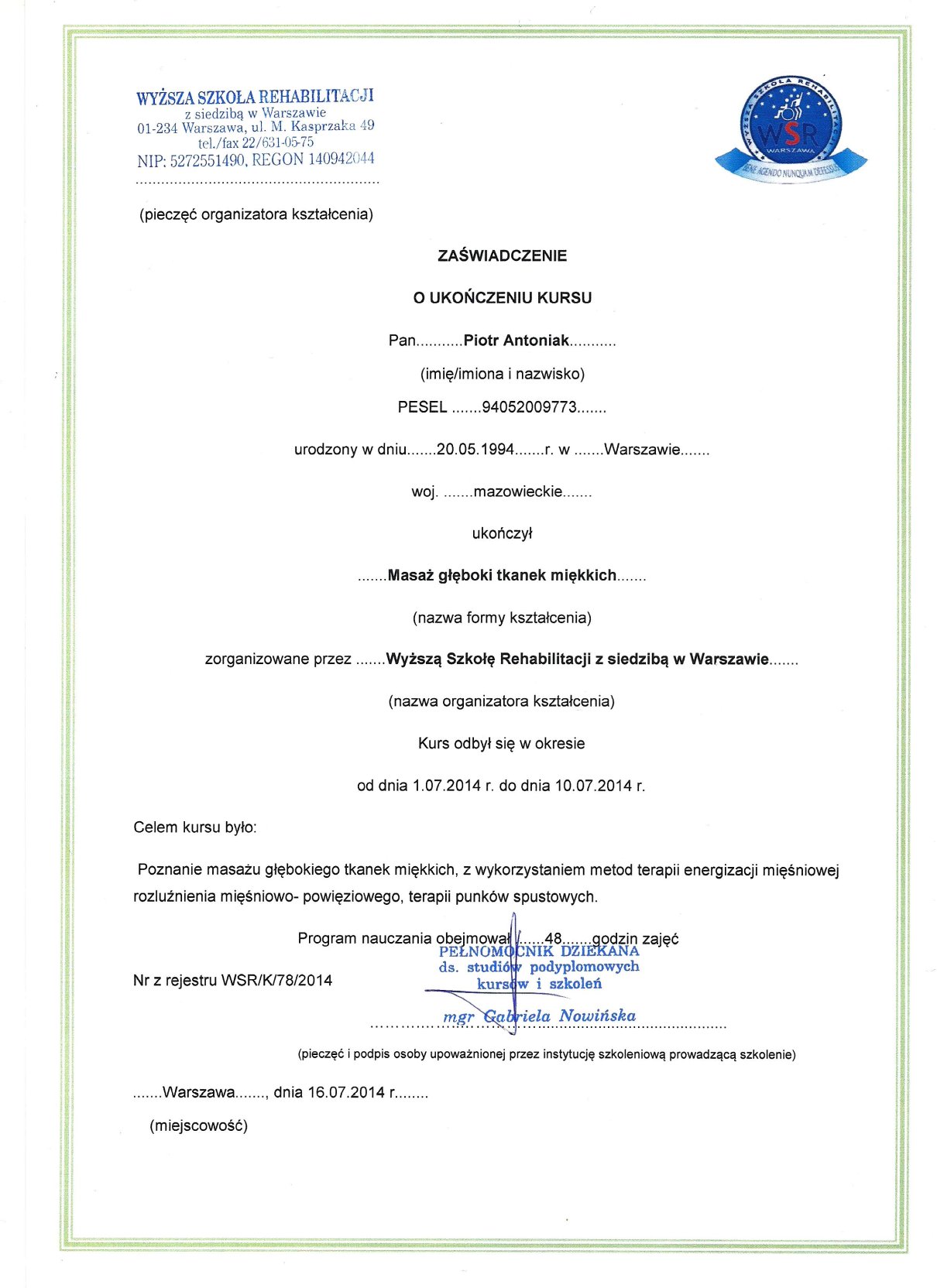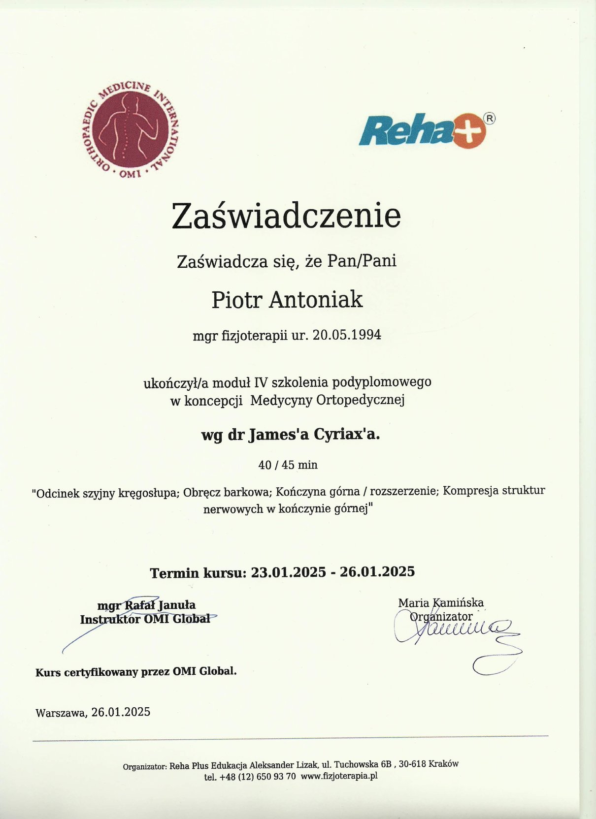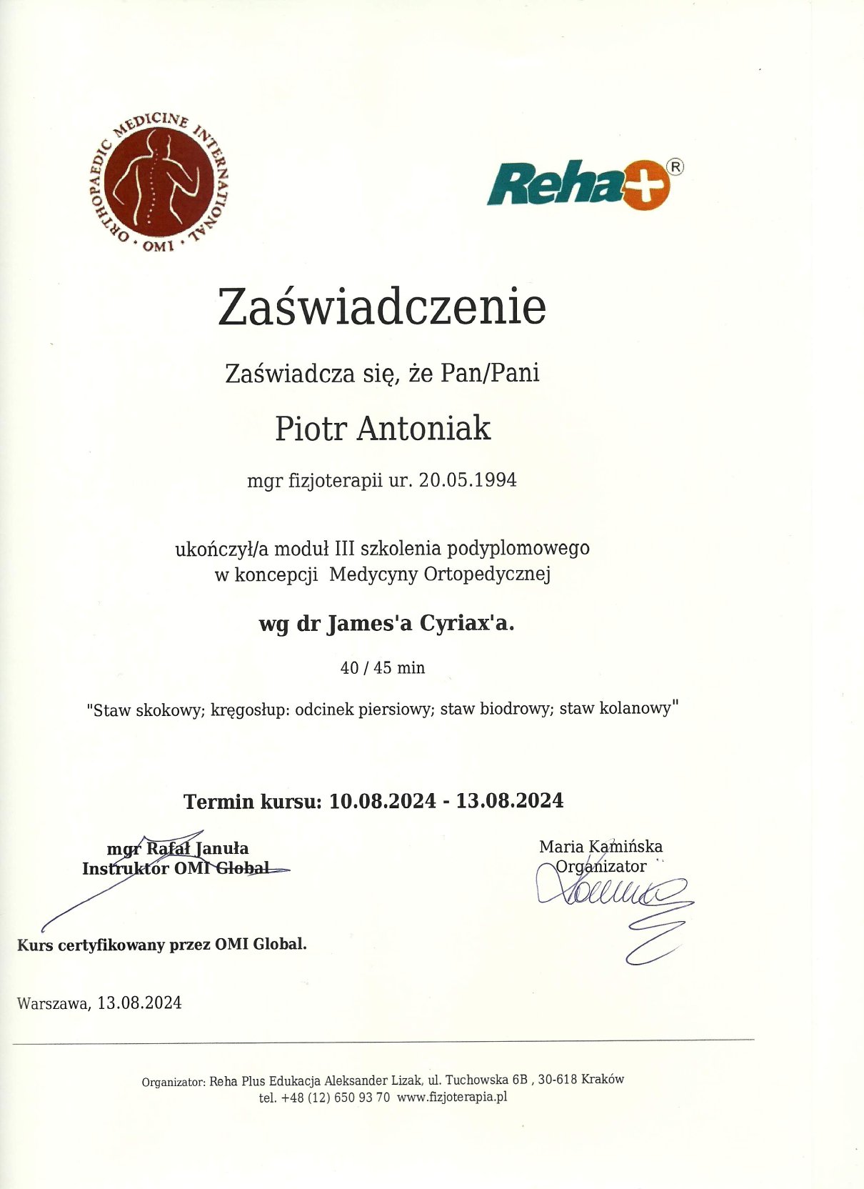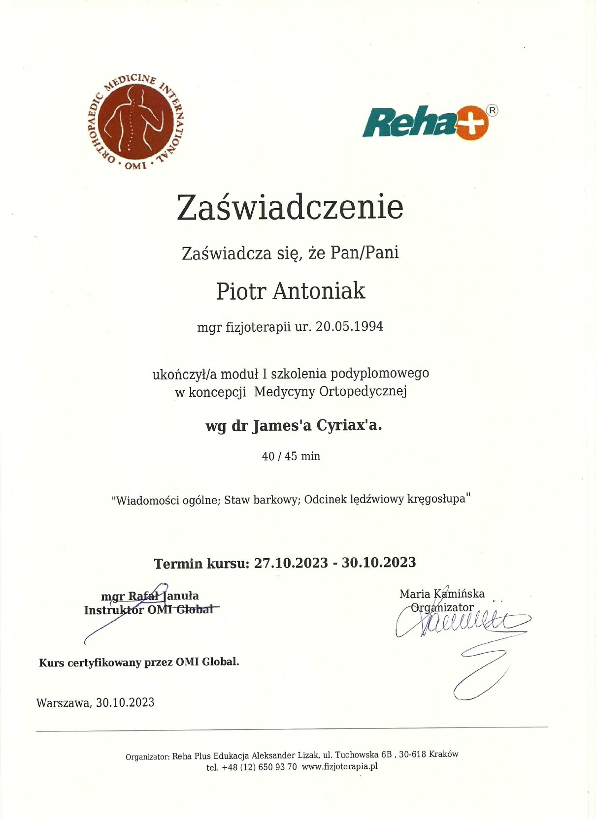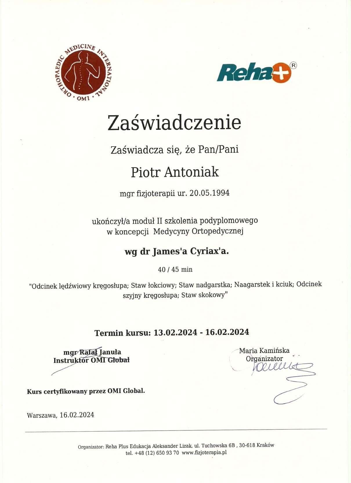 Pracuję także z osobami dorosłymi. Zajmuje się zespołami bólowymi kręgosłupa oraz stawów obwodowych, ograniczeniami ruchomości oraz zespołami przeciążeniowymi. W swojej pracy wykorzystuje takie techniki terapeutyczne, jak m.in.: masaż tkanek głębokich, manipulacje powięzi, igłoterapię suchą.