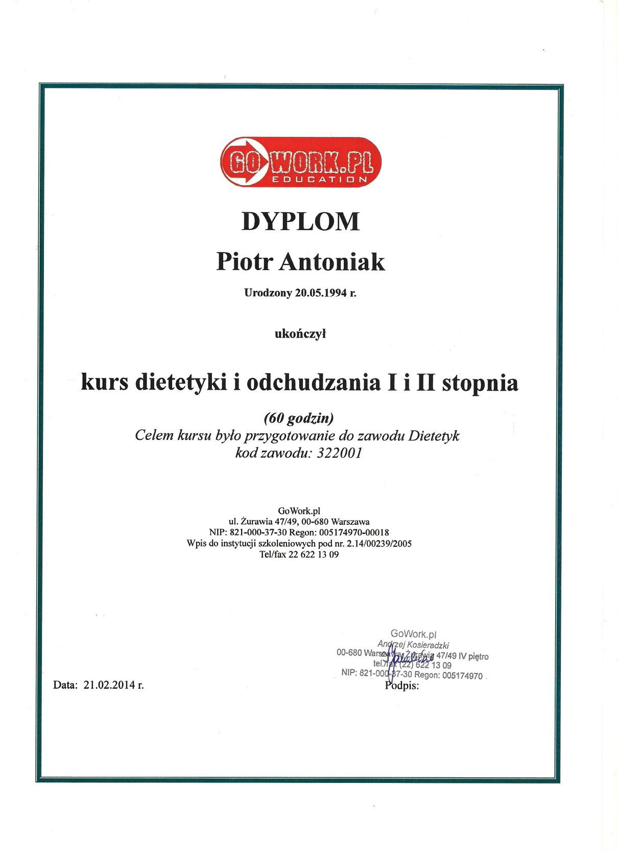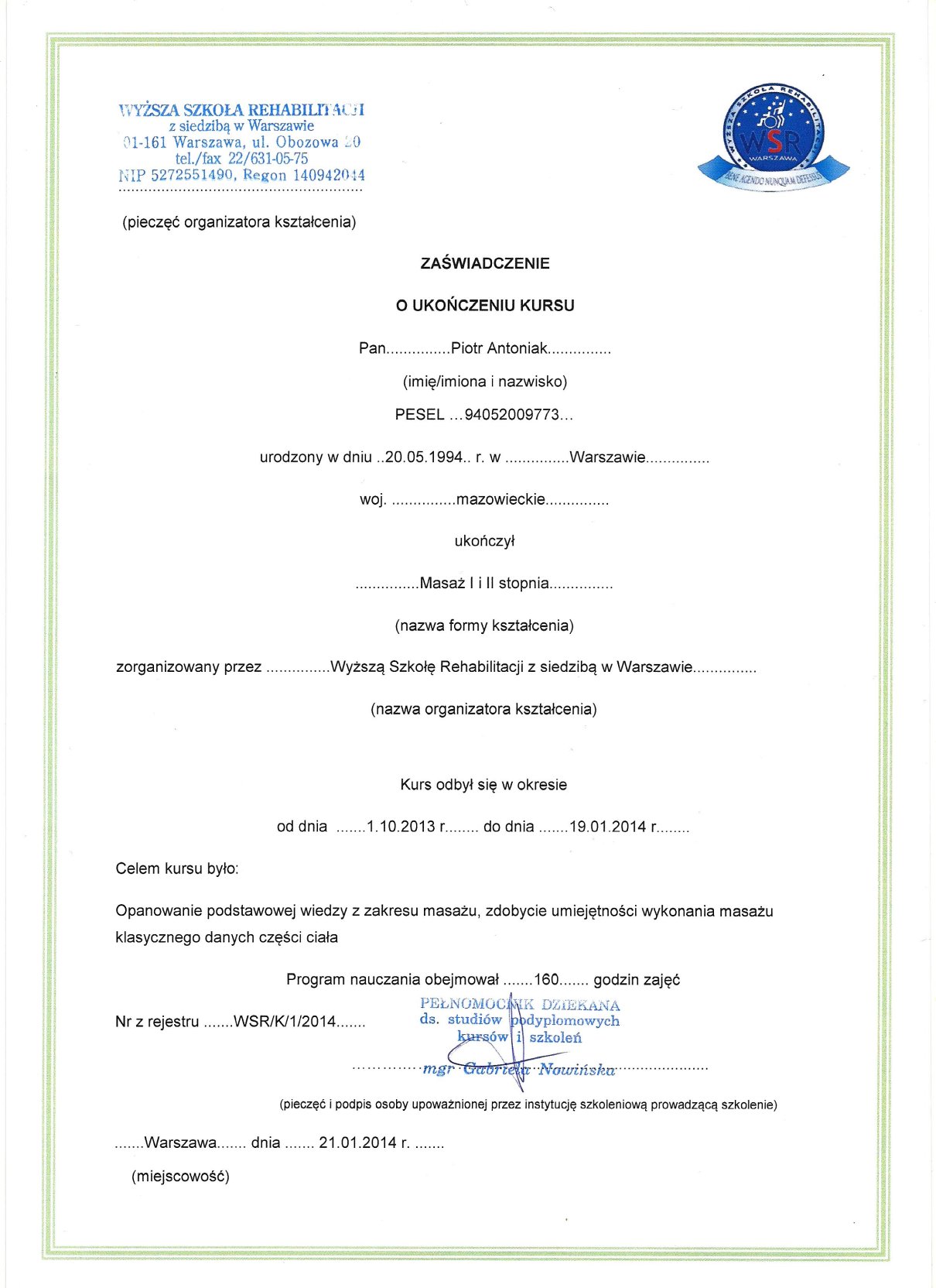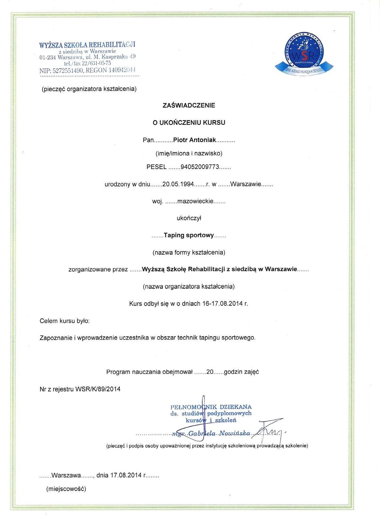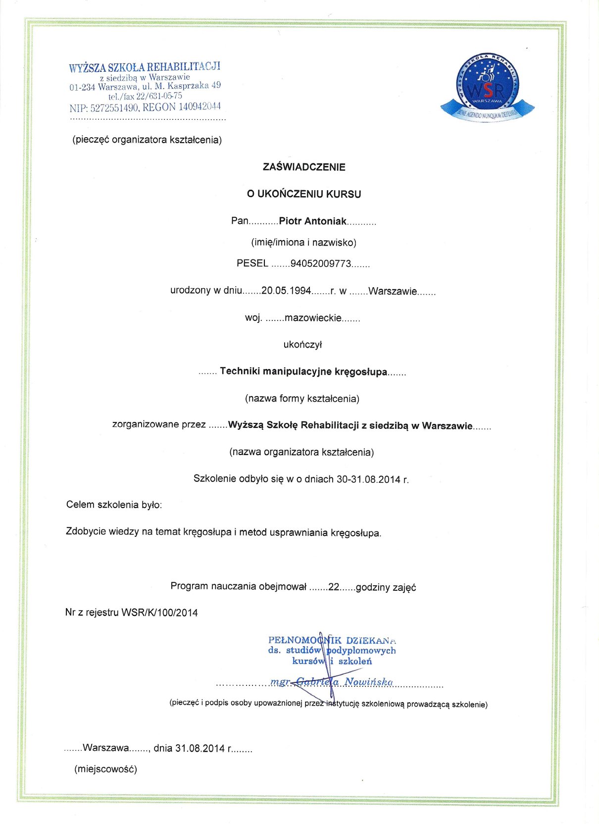 Ukończył Wyższą Szkołę Rehabilitacji w Warszawie uzyskując tytuł magistra fizjoterapii oraz Akademię Pedagogiki Specjalnej na kierunku pedagogika specjalna ze specjalizacją w logopedii.