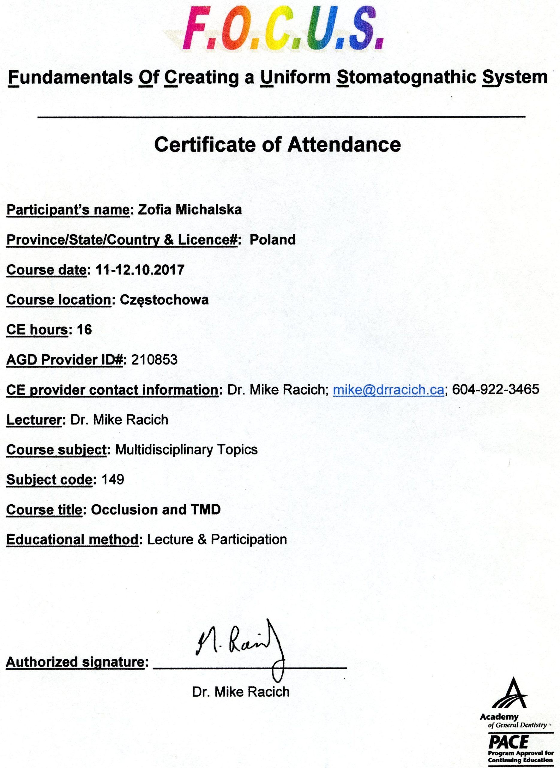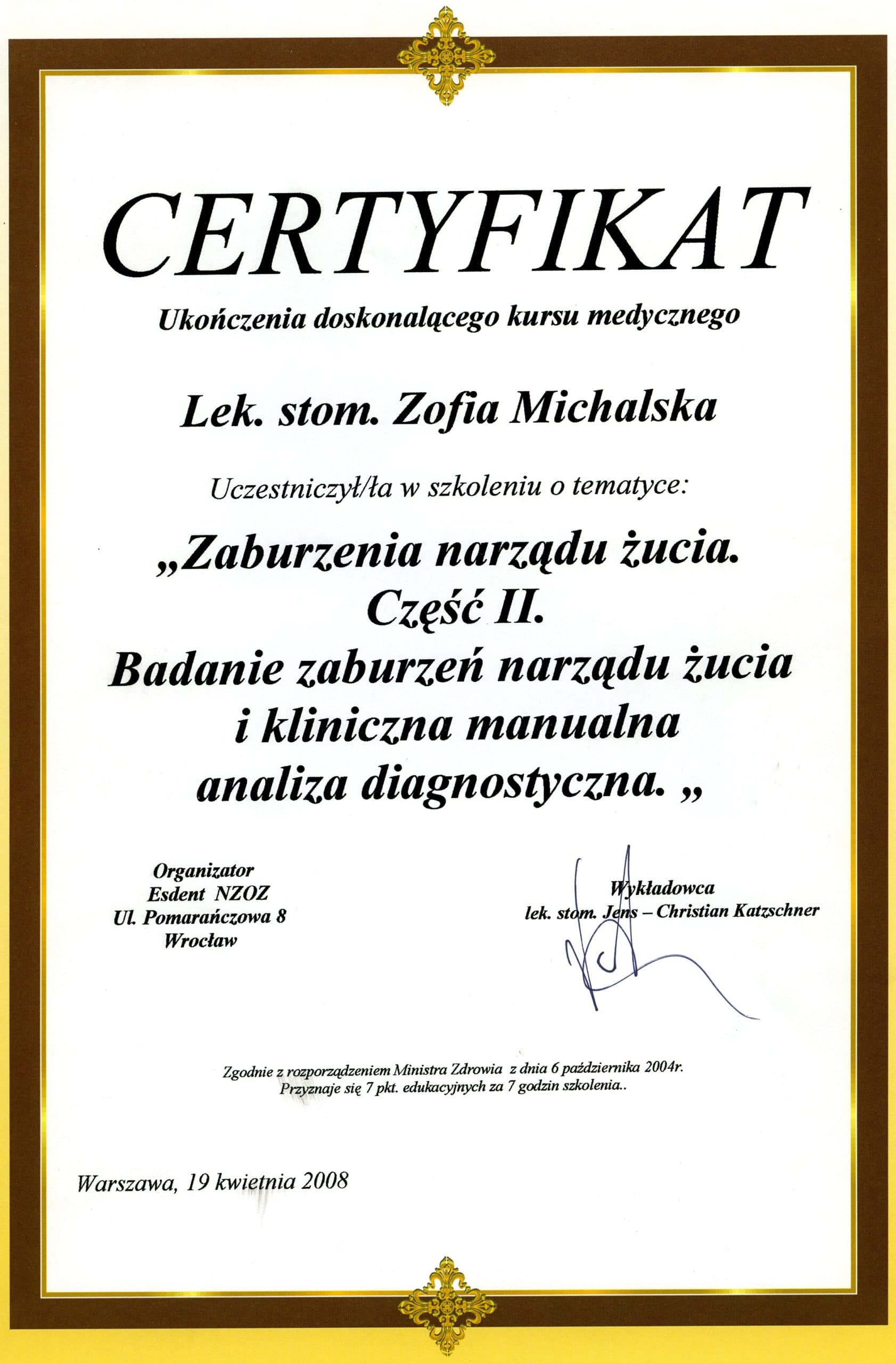 Wiedzę i umiejętności praktyczne z zakresu diagnostyki i leczenia chorób stawów skroniowo-żuchwowych, zaburzonej okluzji (zgryzu), dolegliwości bólowych głowy i szyi zdobywa od wielu lat uczestnicząc w licznych kursach i wykładach.