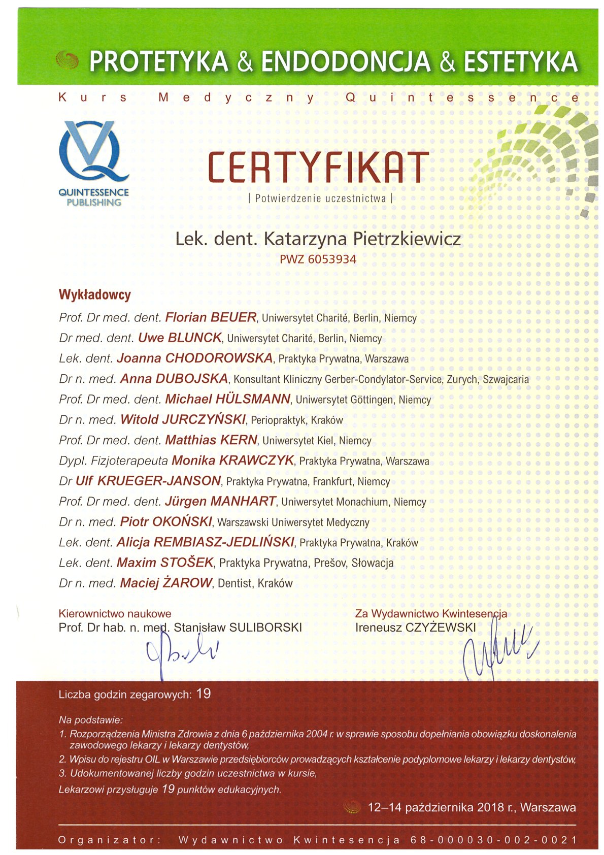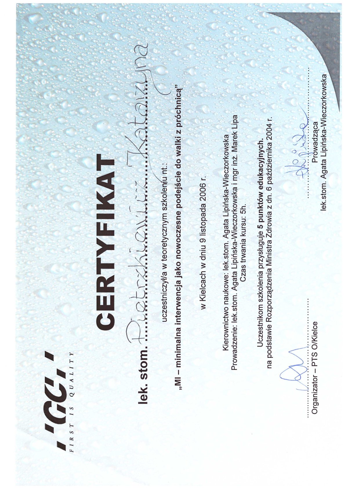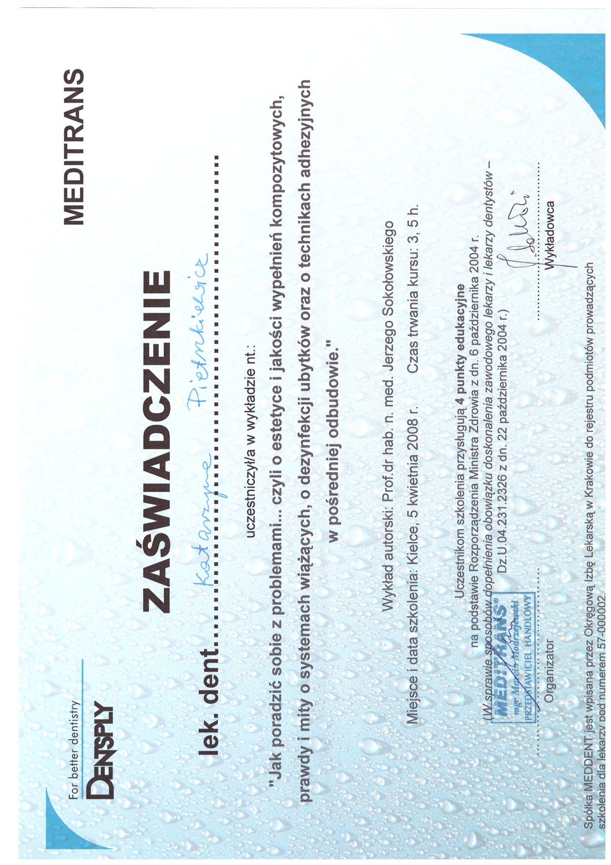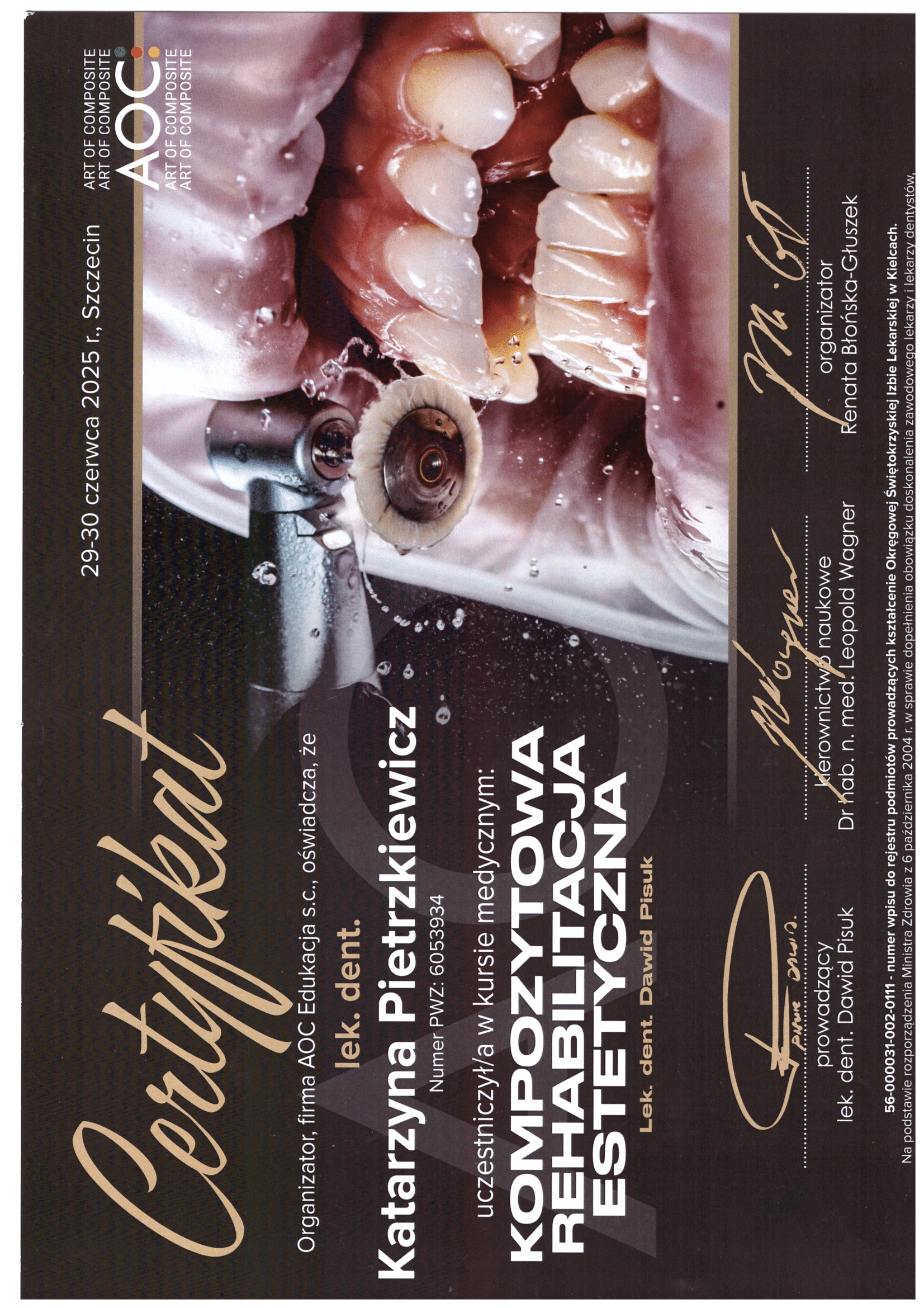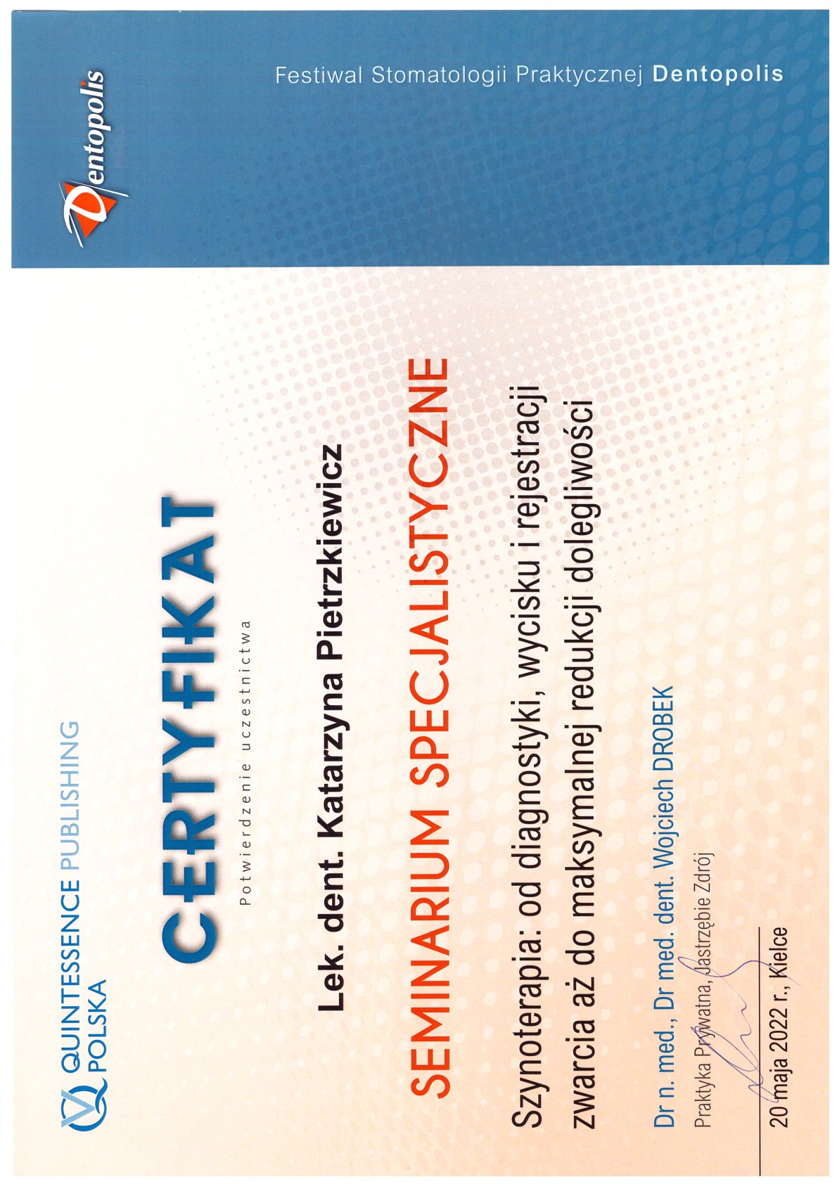 Окончила стоматологический факультет Поморской медицинской академии в Щецине со званием доктора стоматологии. Она совершенствует свой опыт и навыки на многочисленных конгрессах, симпозиумах и практических семинарах под наблюдением самых выдающихся авторитетов в области консервативной и эстетической стоматологии, пародонтологии и протезирования. Она также получает огромное удовольствие от лечения детей. Особенно ее интересует применение современных методов лечения пациентов с известной патологической стираемостью и их протезирование и консервативное лечение. Для проведения точных процедур она использует стоматологические лупы и микроскоп. Пациенты ценят ее за компетентность, четкое объяснение стоматологических сложностей и дружелюбную атмосферу.
