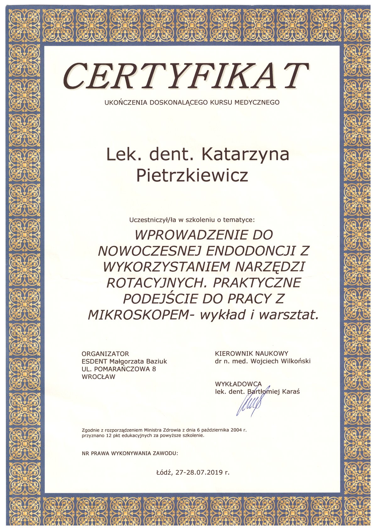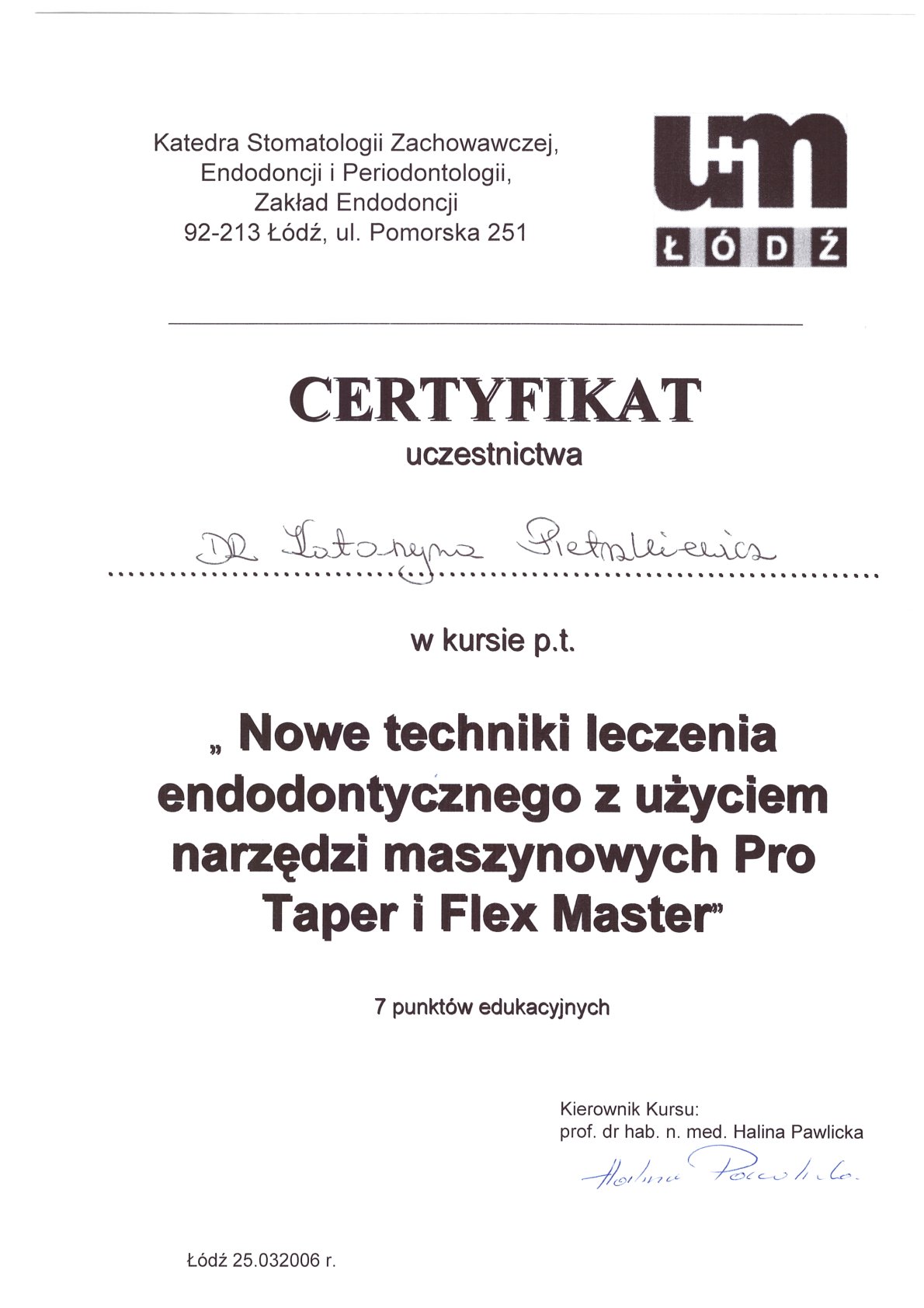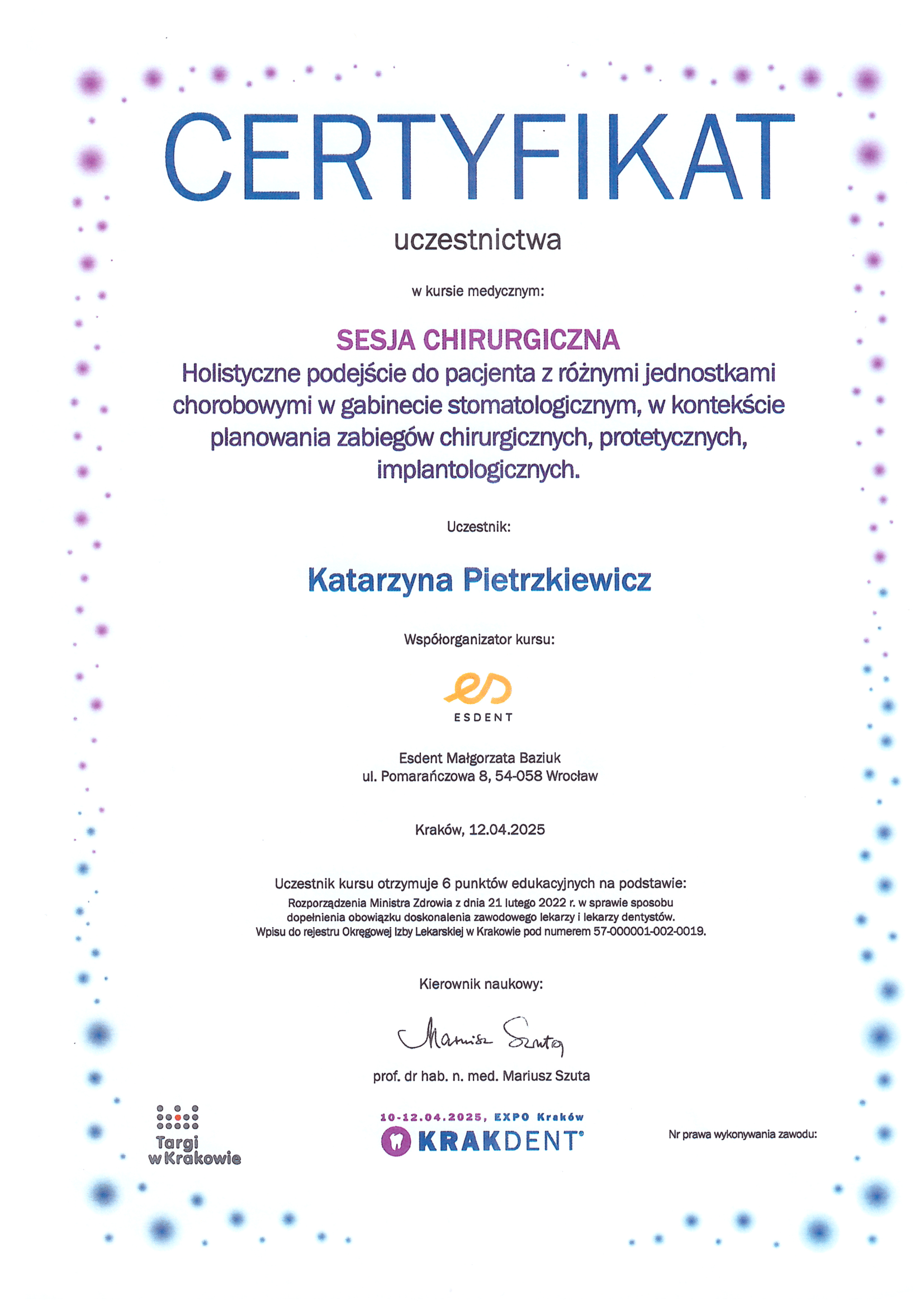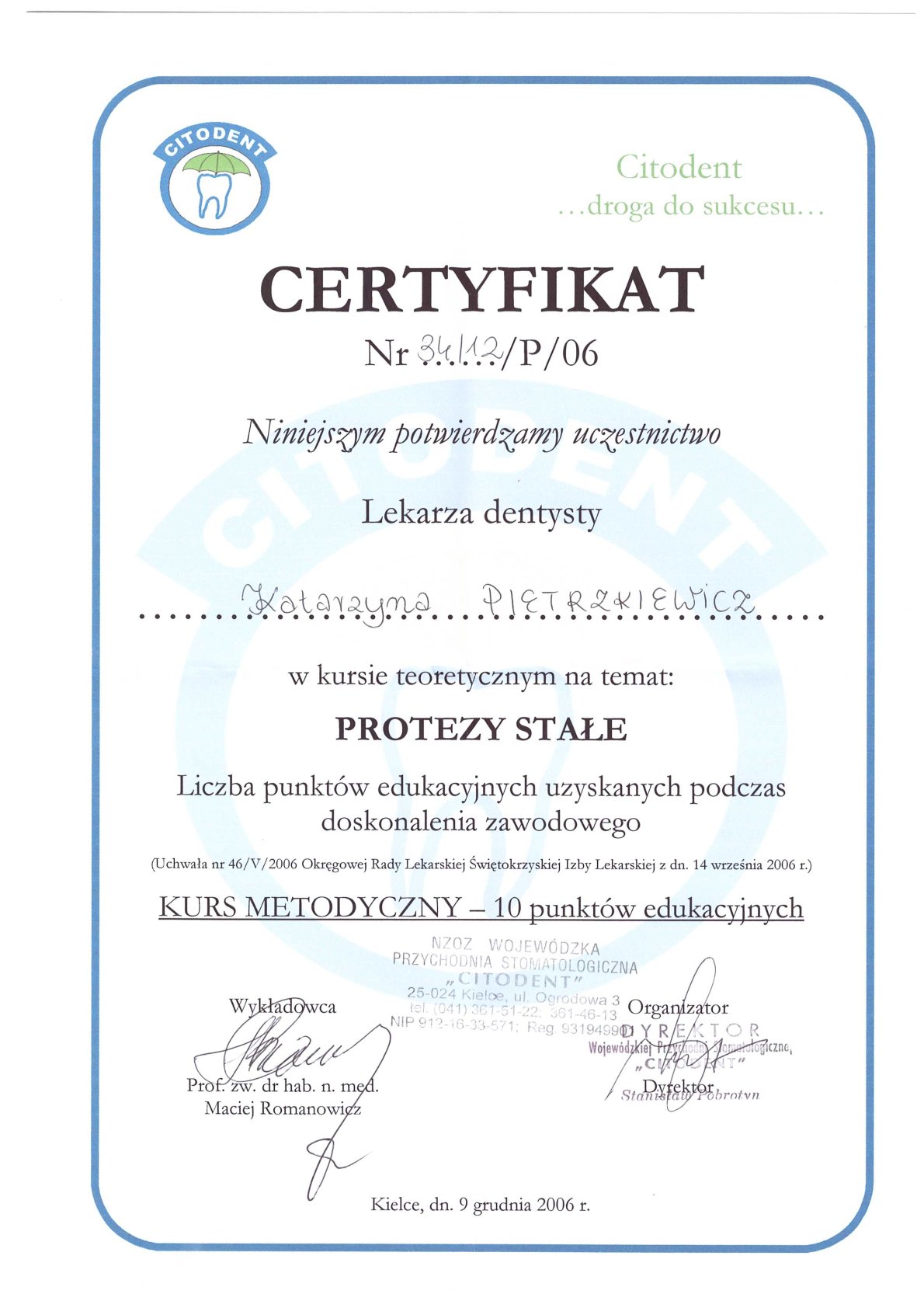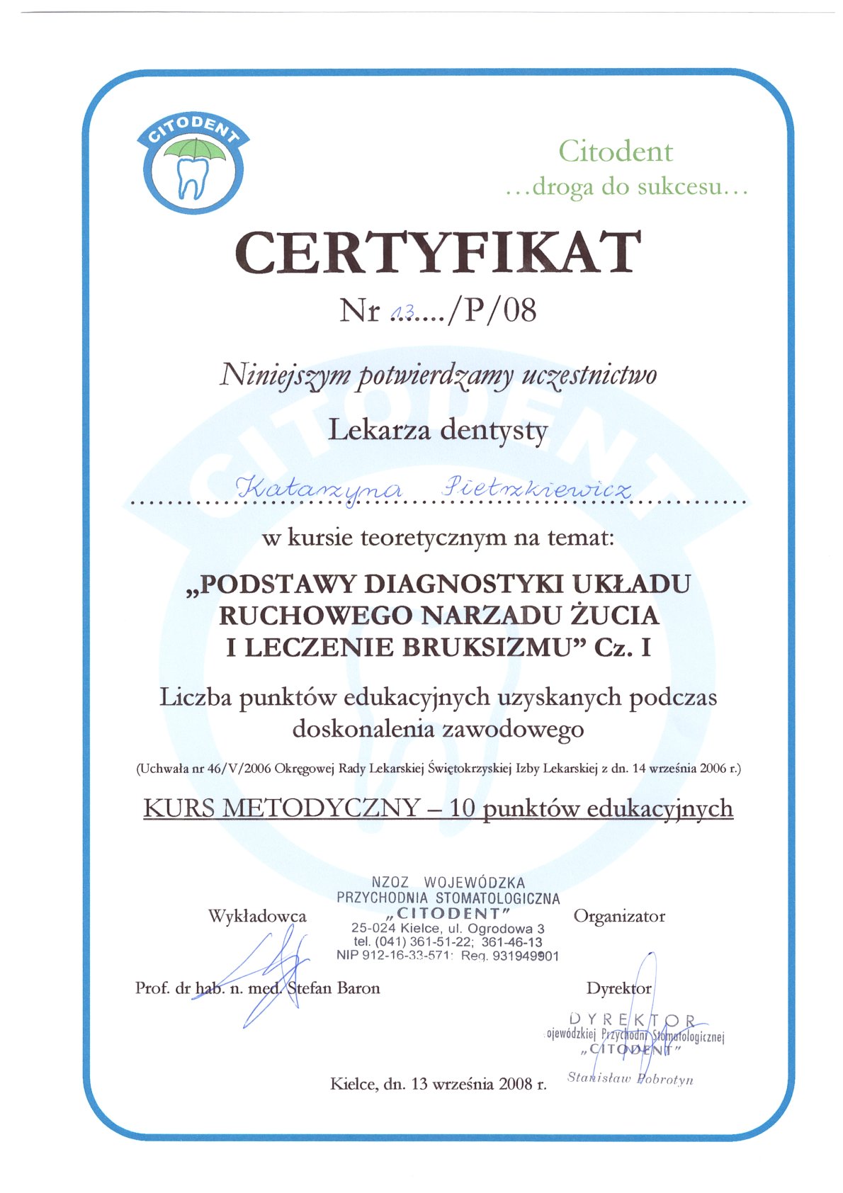 Окончила стоматологический факультет Поморской медицинской академии в Щецине со званием доктора стоматологии. Она совершенствует свой опыт и навыки на многочисленных конгрессах, симпозиумах и практических семинарах под наблюдением самых выдающихся авторитетов в области консервативной и эстетической стоматологии, пародонтологии и протезирования. Она также получает огромное удовольствие от лечения детей. Особенно ее интересует применение современных методов лечения пациентов с известной патологической стираемостью и их протезирование и консервативное лечение. Для проведения точных процедур она использует стоматологические лупы и микроскоп. Пациенты ценят ее за компетентность, четкое объяснение стоматологических сложностей и дружелюбную атмосферу.