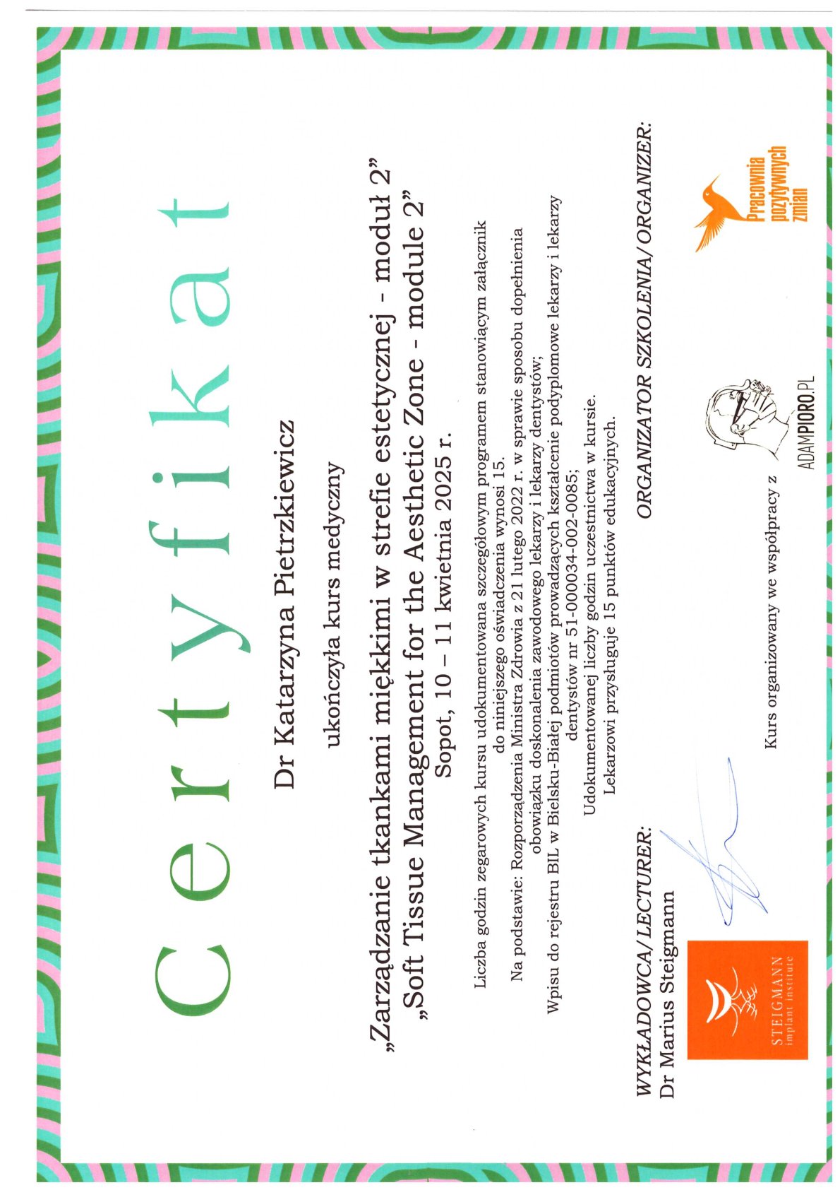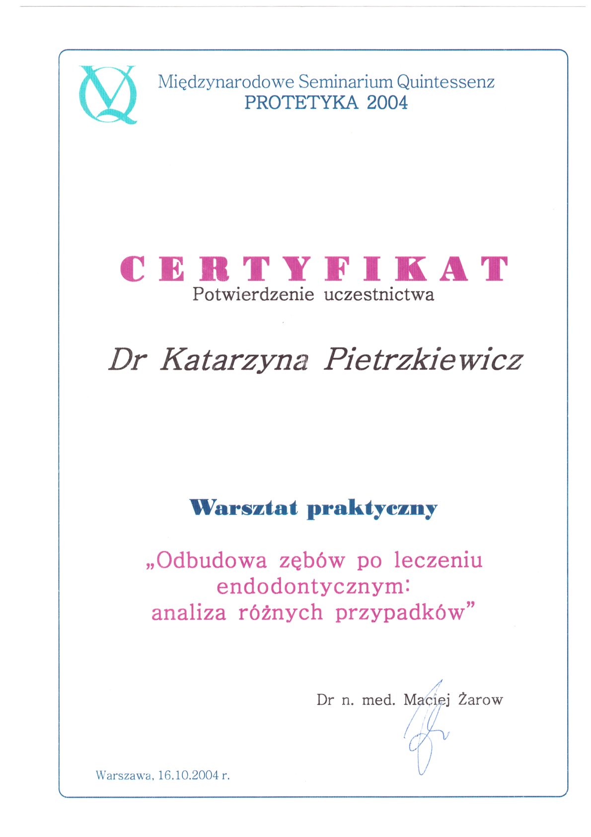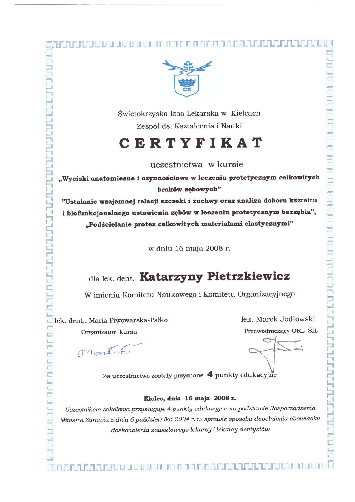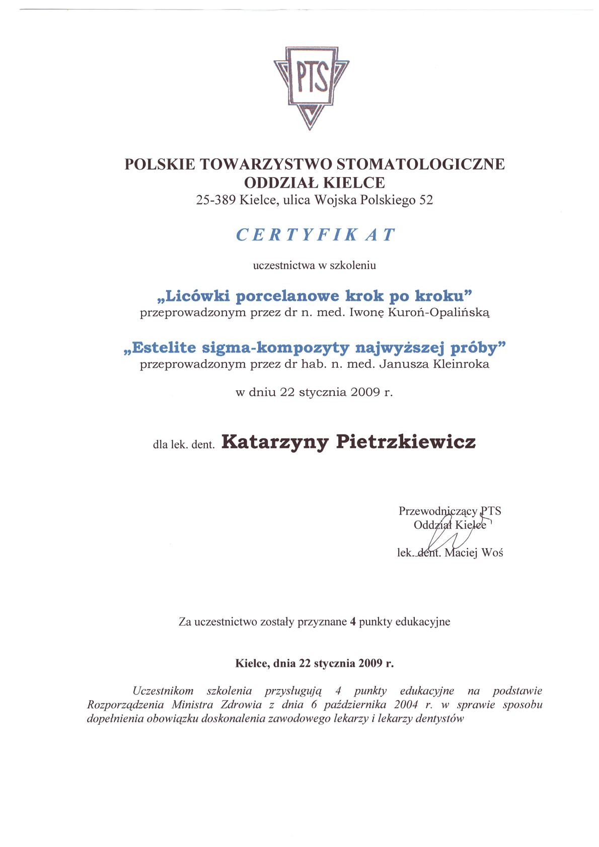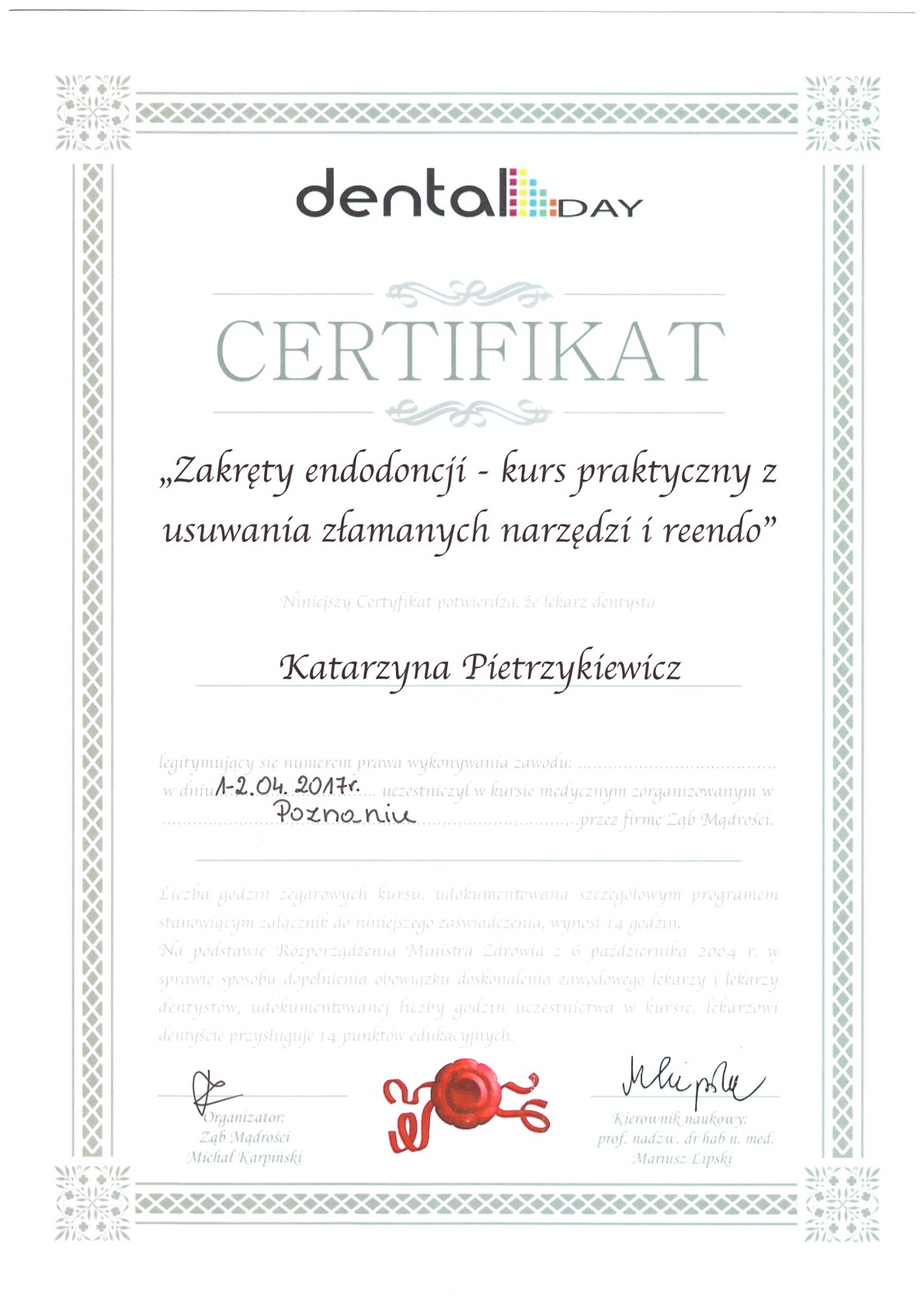 Окончила стоматологический факультет Поморской медицинской академии в Щецине со званием доктора стоматологии. Она совершенствует свой опыт и навыки на многочисленных конгрессах, симпозиумах и практических семинарах под наблюдением самых выдающихся авторитетов в области консервативной и эстетической стоматологии, пародонтологии и протезирования. Она также получает огромное удовольствие от лечения детей. Особенно ее интересует применение современных методов лечения пациентов с известной патологической стираемостью и их протезирование и консервативное лечение. Для проведения точных процедур она использует стоматологические лупы и микроскоп. Пациенты ценят ее за компетентность, четкое объяснение стоматологических сложностей и дружелюбную атмосферу.
