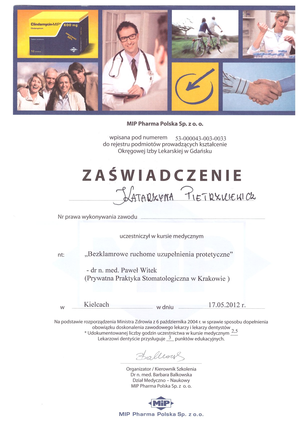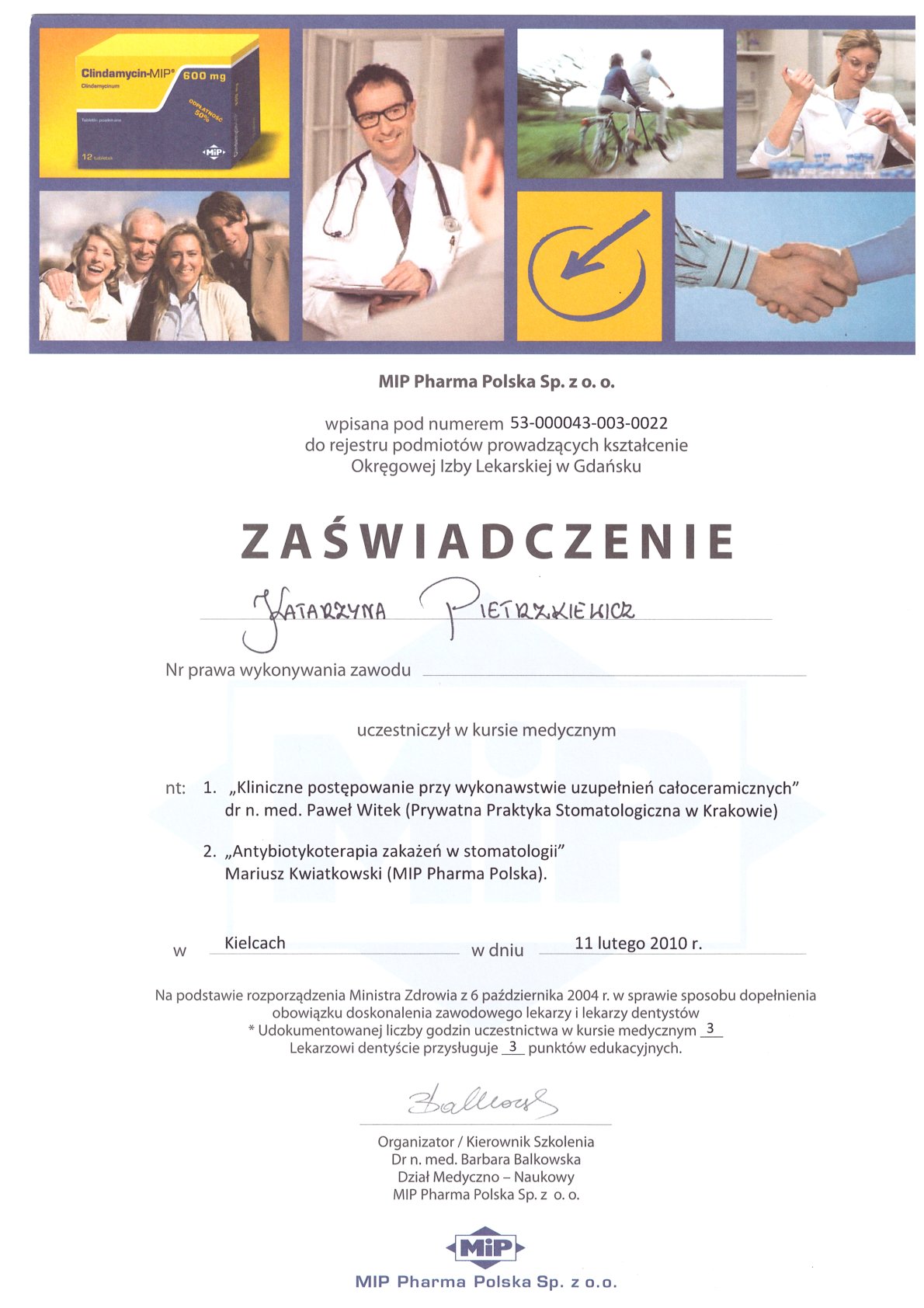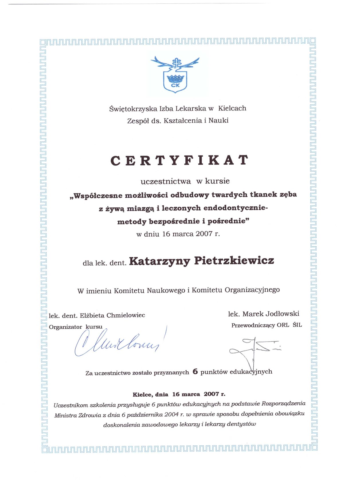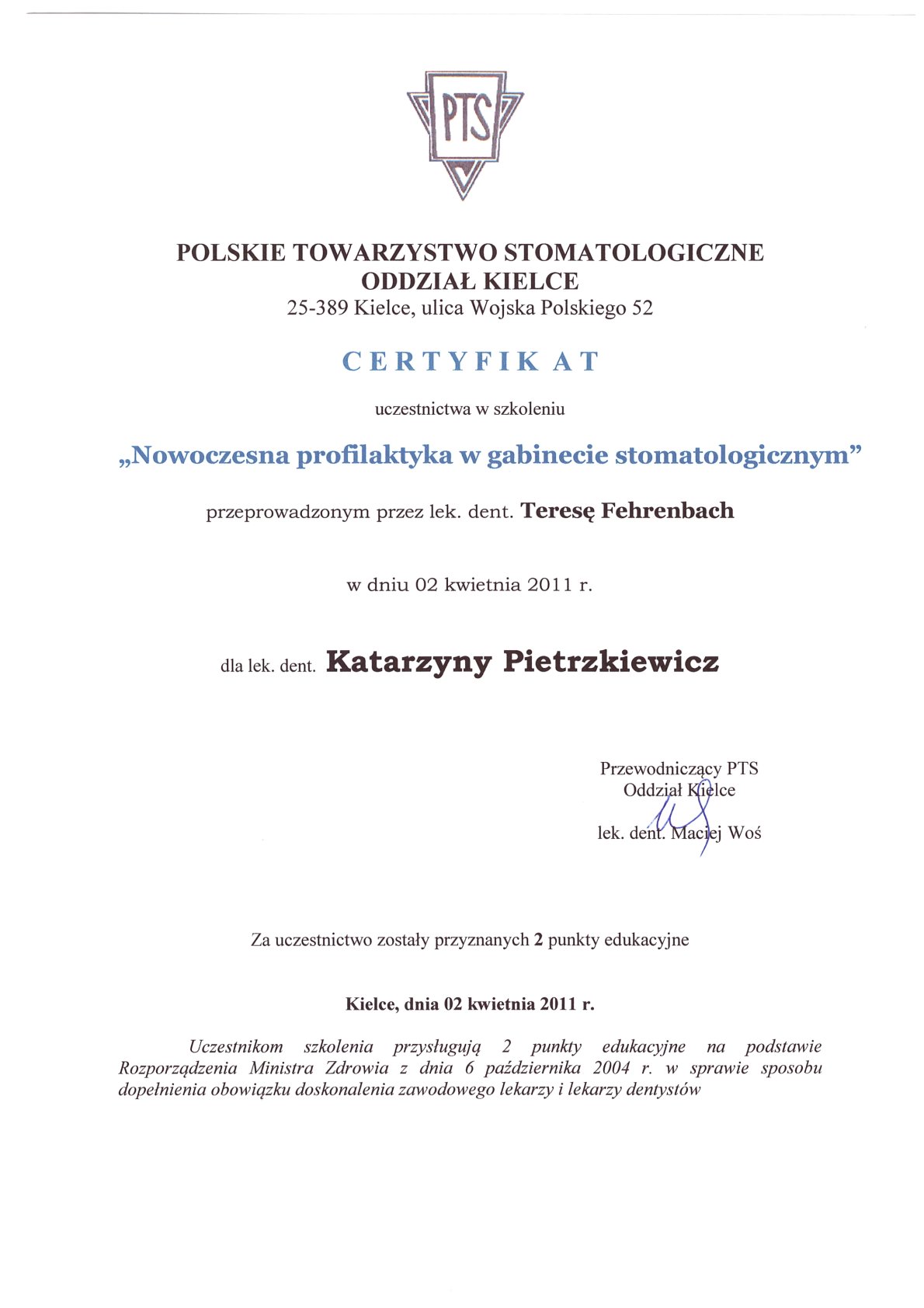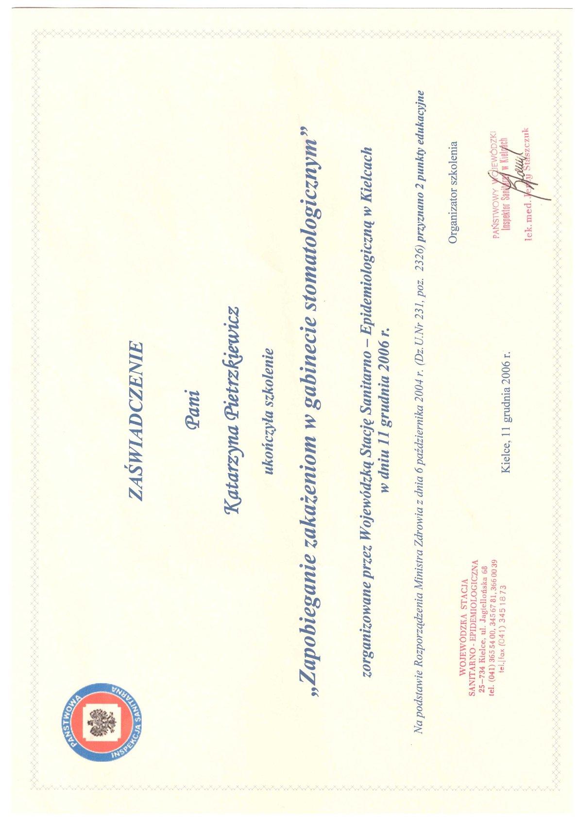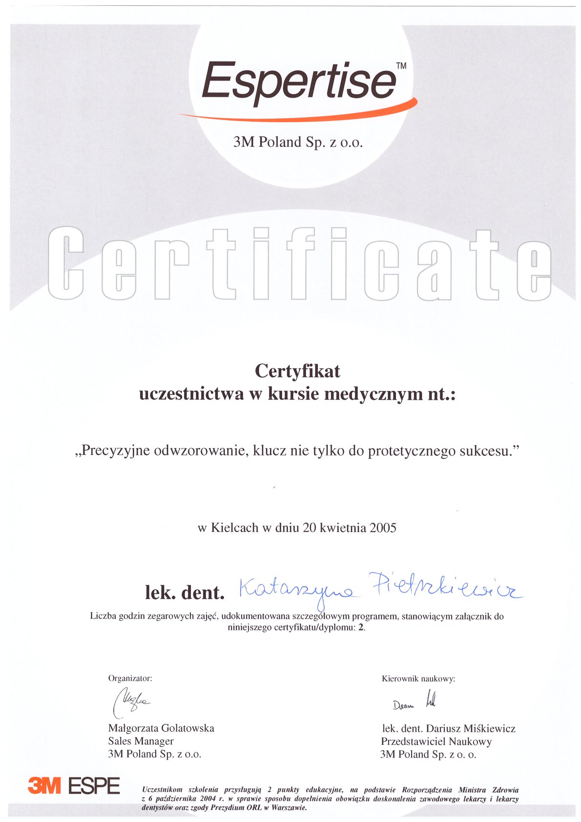 Окончила стоматологический факультет Поморской медицинской академии в Щецине со званием доктора стоматологии. Она совершенствует свой опыт и навыки на многочисленных конгрессах, симпозиумах и практических семинарах под наблюдением самых выдающихся авторитетов в области консервативной и эстетической стоматологии, пародонтологии и протезирования. Она также получает огромное удовольствие от лечения детей. Особенно ее интересует применение современных методов лечения пациентов с известной патологической стираемостью и их протезирование и консервативное лечение. Для проведения точных процедур она использует стоматологические лупы и микроскоп. Пациенты ценят ее за компетентность, четкое объяснение стоматологических сложностей и дружелюбную атмосферу.