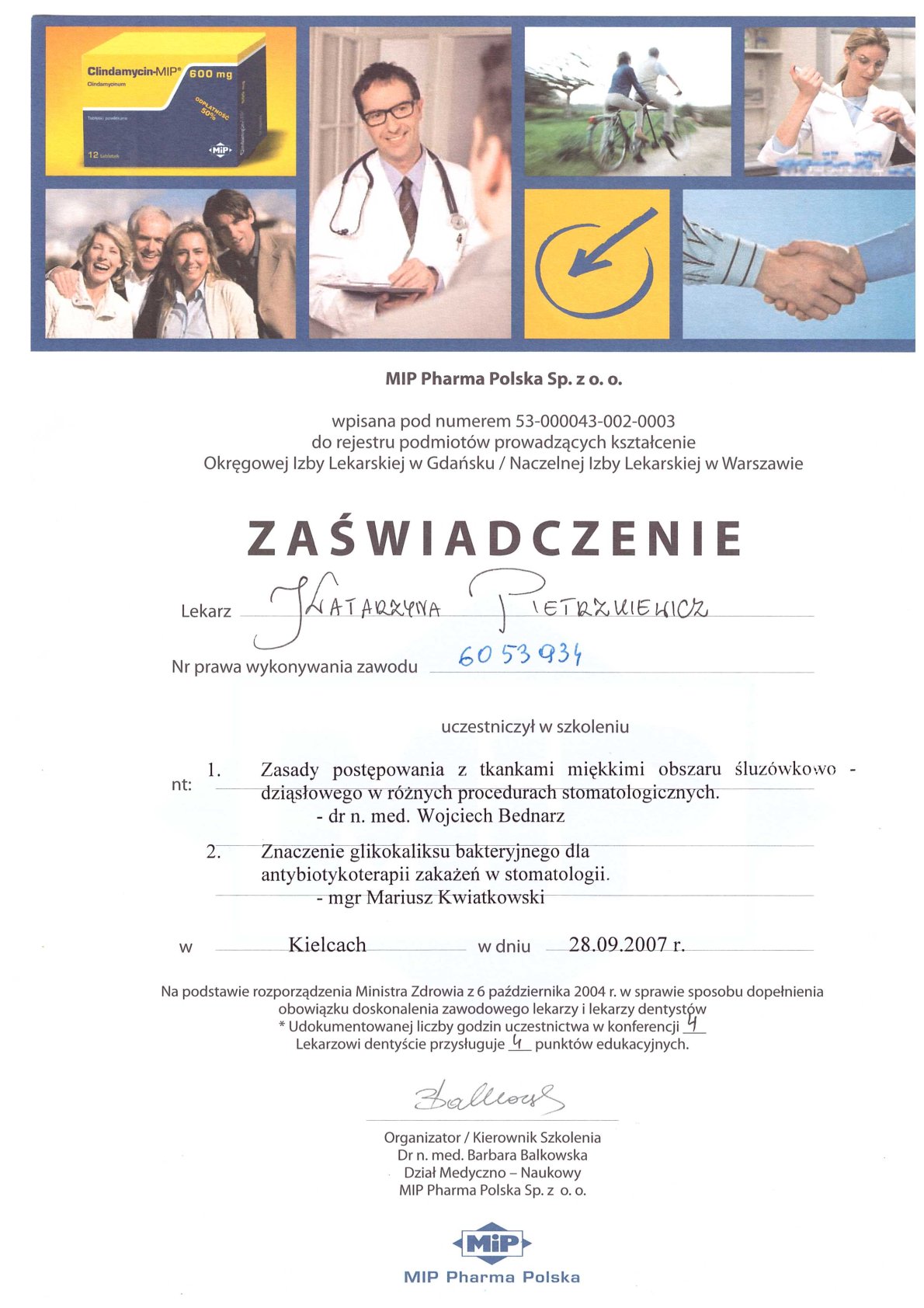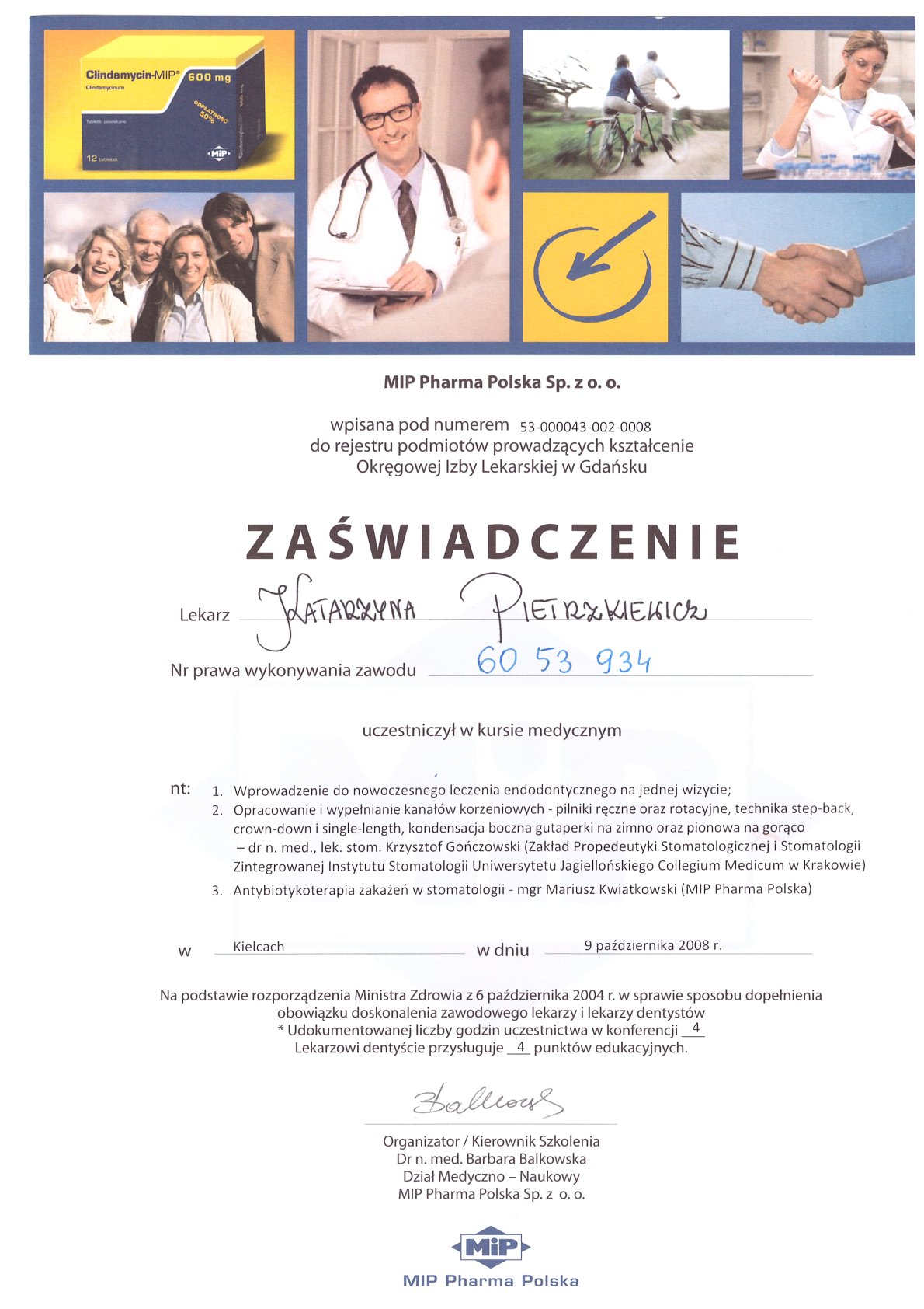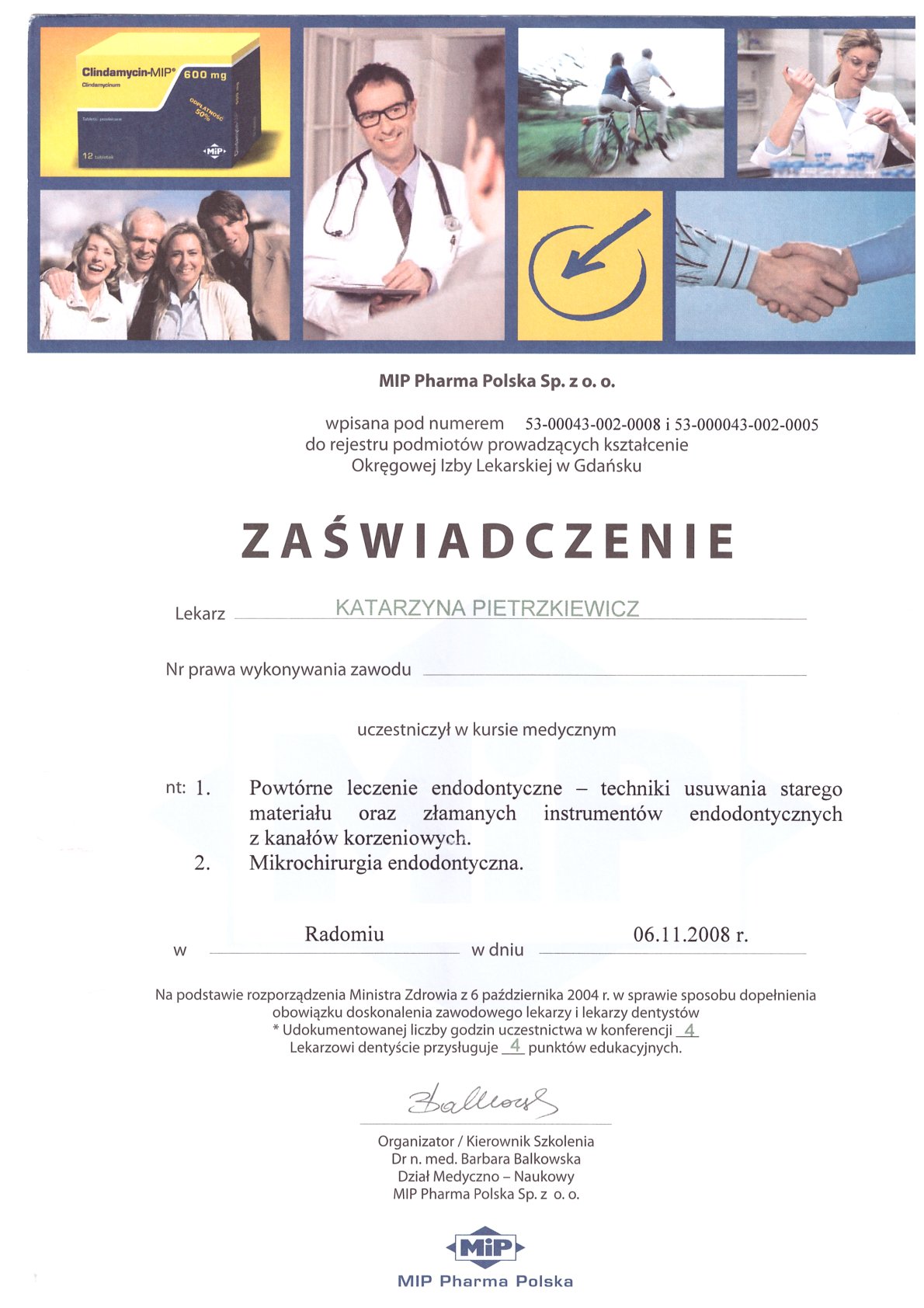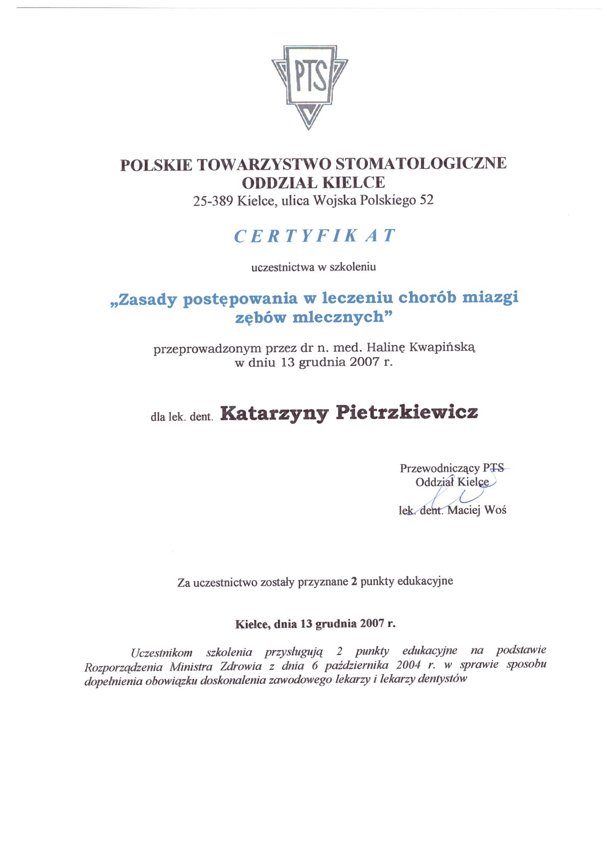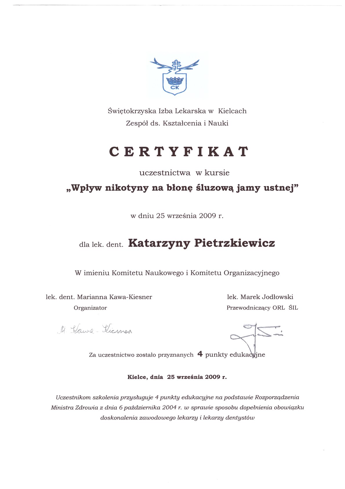 Окончила стоматологический факультет Поморской медицинской академии в Щецине со званием доктора стоматологии. Она совершенствует свой опыт и навыки на многочисленных конгрессах, симпозиумах и практических семинарах под наблюдением самых выдающихся авторитетов в области консервативной и эстетической стоматологии, пародонтологии и протезирования. Она также получает огромное удовольствие от лечения детей. Особенно ее интересует применение современных методов лечения пациентов с известной патологической стираемостью и их протезирование и консервативное лечение. Для проведения точных процедур она использует стоматологические лупы и микроскоп. Пациенты ценят ее за компетентность, четкое объяснение стоматологических сложностей и дружелюбную атмосферу.
